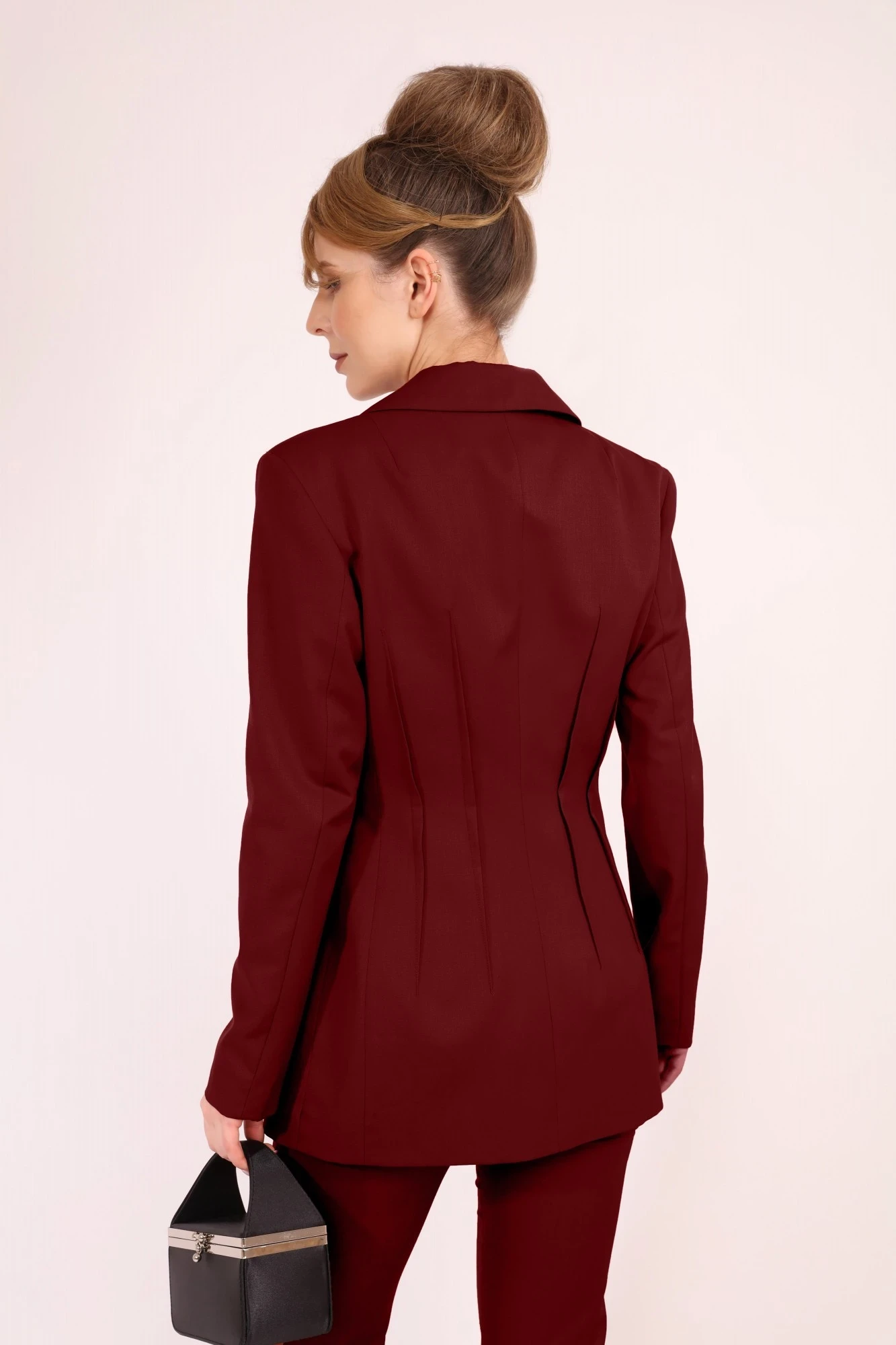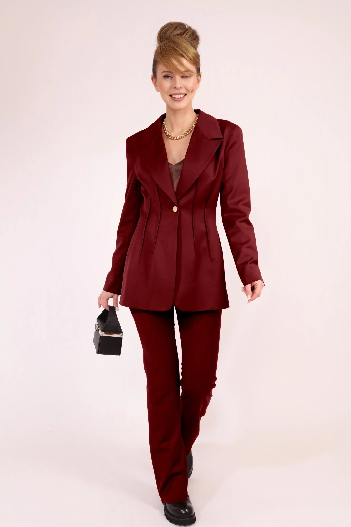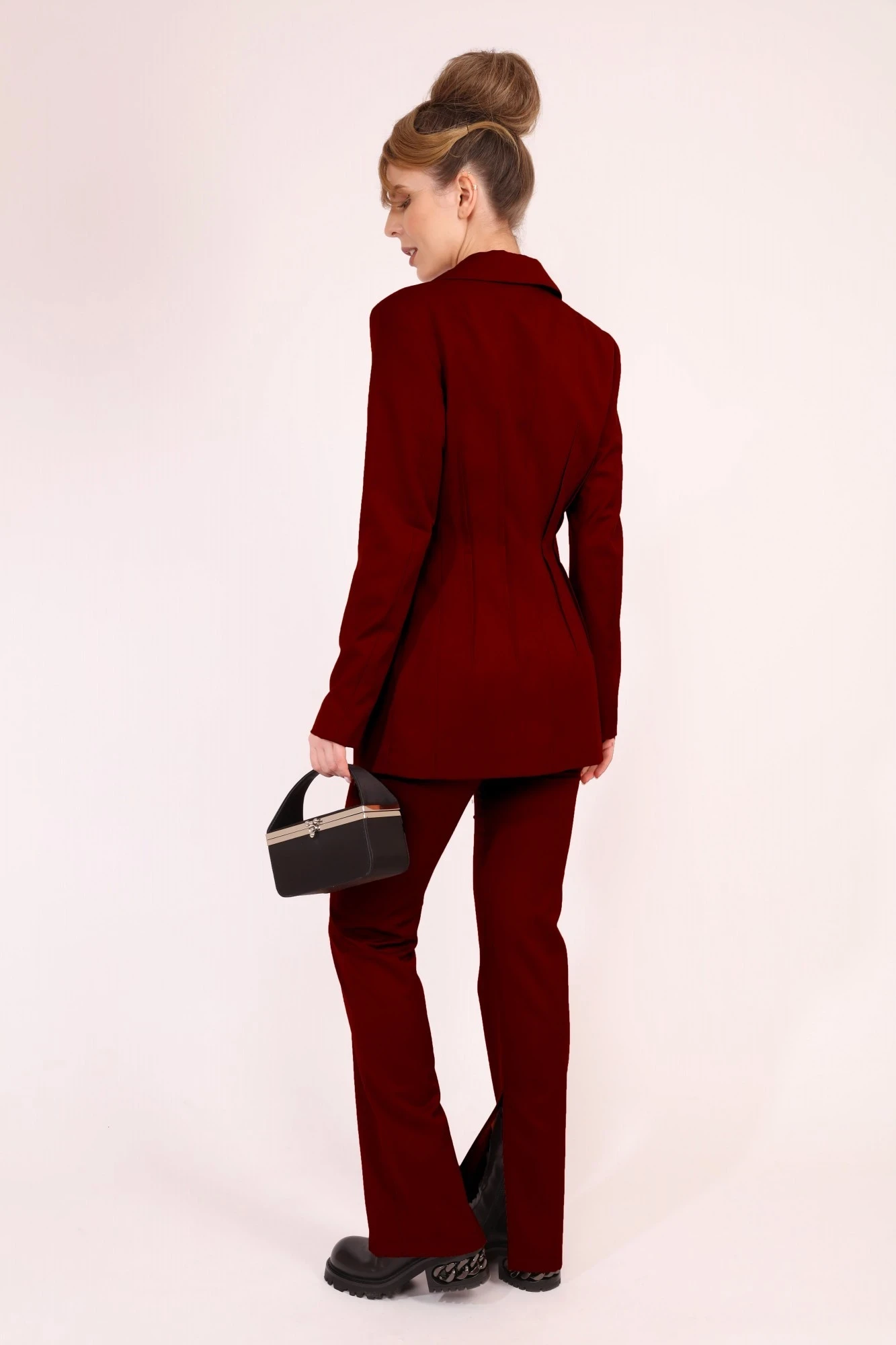 Тонкий шерстяной костюм вообще можно назвать универсальным, поскольку он подойдет для носки в любое время года. Дизайнеры экспериментируют с расцветками и фасонами, создавая новые идеалы. Жакет однобортный умеренного объема, приталенного силуэта. Силуэт изделия создается за счет отрезных бочков на спинке и полочке, а также за счет среднего шва и плечевых вытачек на спинке. На полочке нагрудная вытачка переведена в плечевой шов. Плечевой пояс расширен и поддерживается плечевыми накладками. Рукав втачной, длинный, двухшовный. Воротник отложной с отрезной стойкой, пиджачного типа. Застежка на уровне линии талии на одну петлю и пуговицу. Жакет полностью обработан притачной подкладкой. Длина изделия до середины бедер. Женские брюки малого объема, прямого силуэта. На передних половинках с обеих сторон расположены под наклоном нефункциональные прорезные карманы в рамку. На задних половинках расположены вытачки. Пояс отрезной. На поясе расположены шлевки. Застежка брюк – гульфик на молнии, на поясе крючок и петля. В нижней части шаговых швов оформлены высокие разрезы. Длина брюк ниже уровня щиколоток – увеличена с учетом высоты каблука. Фурнитура и материалы отделки могут незначительно отличаться от тех, что на фотографии.