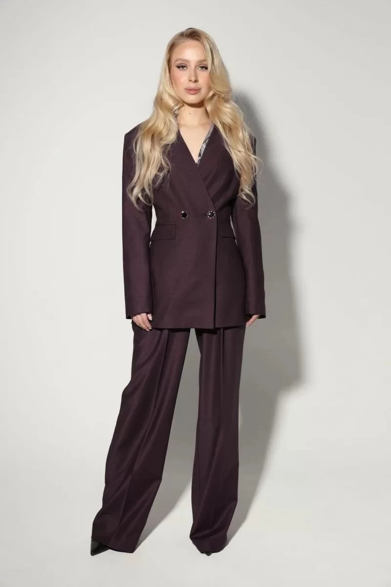 Двубортный жакет полуприлегающего силуэта с застёжкой на две пуговицы с прорезными карманами с листочками и клапанами. Нагрудные вытачки на полочках расположены вертикально и совмещены с талиевыми, заканчиваются входом в карман. Спинка имеет плечевые вытачки, средний шов со шлицей. Рукава двухшовные, длинные. Воротник – стойка переходит в край борта, имеющий V-образную форму. Застежка на прорезные петли и пуговицы. Жакет полностью обработан притачной подкладкой.
