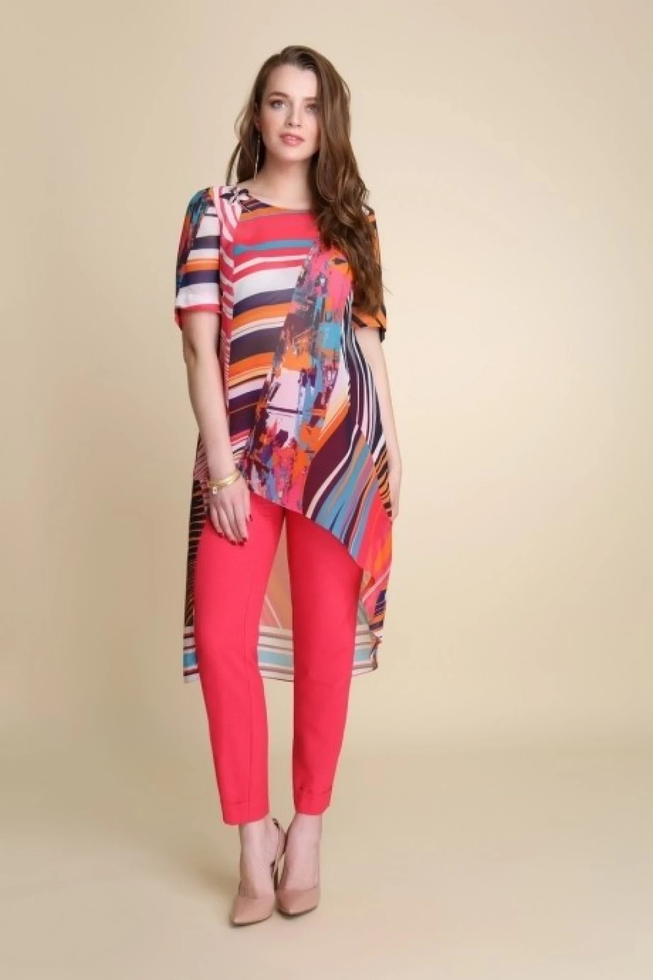 ПРИМЕЧАНИЕ: ЦВЕТ БРЮК ОТЛИЧАЕТСЯ ОТ ФОТО - В ОРАНЖЕВОМ ЦВЕТЕ (как на дополнительном фото). Комплект женский,двухпредметный,состоящий из блузы и брюк. Блузка женская,удлиненная,с нагрудными вытачками по переду,спинка цельная,рукава втачные,одношовные.Низ блузки и рукавов фигурный.Горловина овальной формы,длина по спинке 106 см. Брюки прямые, заужены к низу,по переду обработаны карманы с отрезным бочком,застежка на тесьму-молнию и 1 пуговицу.На задних половинках обработаны вытачки,пояс в брюках на притачном поясе.Длина брюк от талии по боковому шву 96см.
