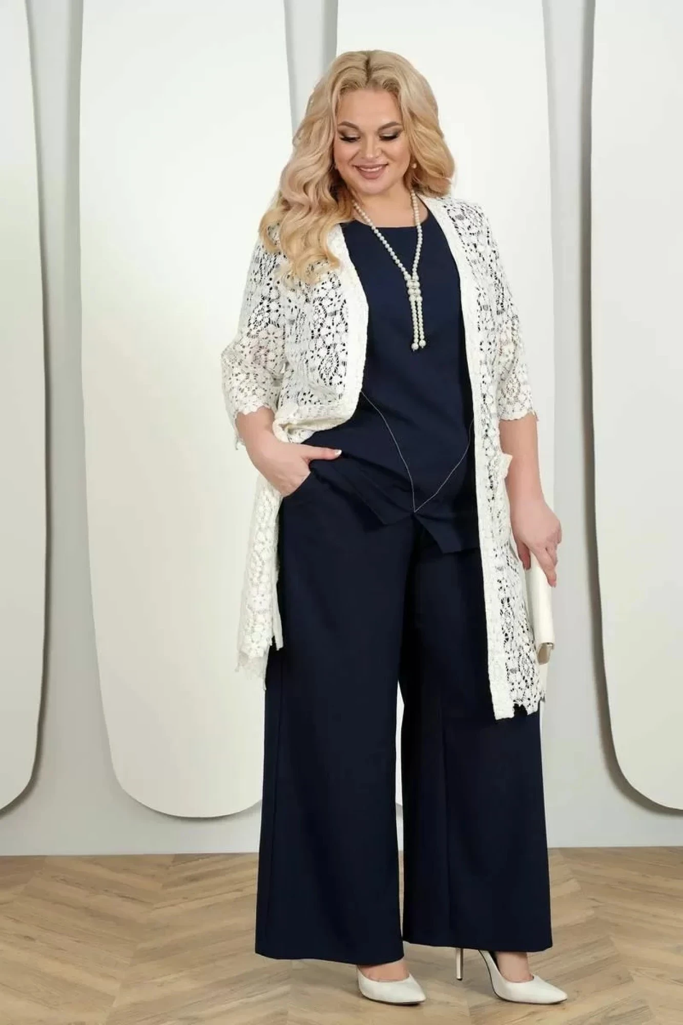 Брюки прямые, с посадкой на талии, на притачном поясе с резинкой вдоль всего пояса. На передних половинках брюк расположены наклонные боковые карманы.