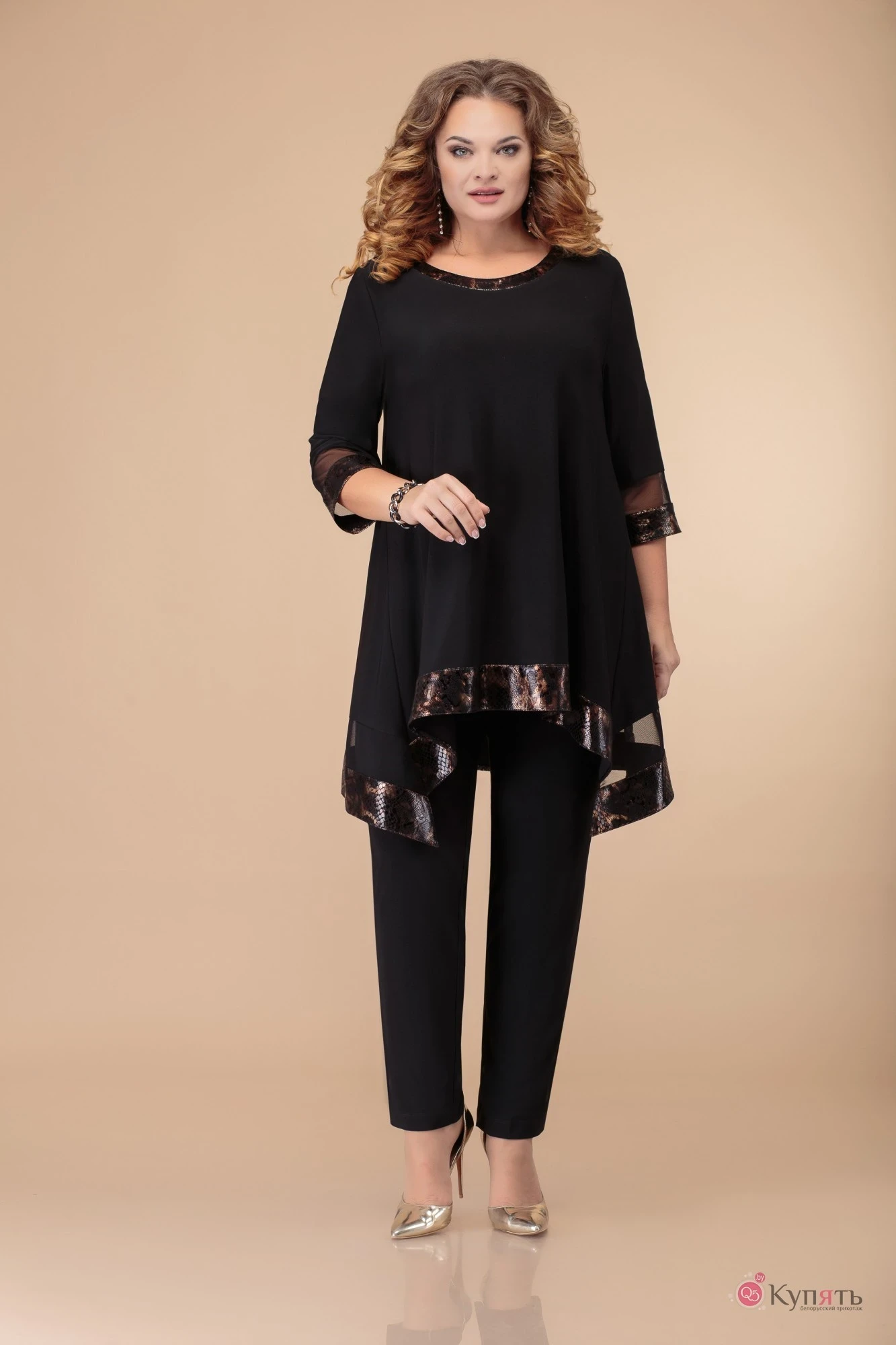 Туника А-силуэта с втачным рукавом. Низ туники фигурной формы с удлинением на спину. По низу спинки туники и рукавам вставка из сетки. Низ рукавов, переда и спинки, а также бейка горловины из отделочного материала.