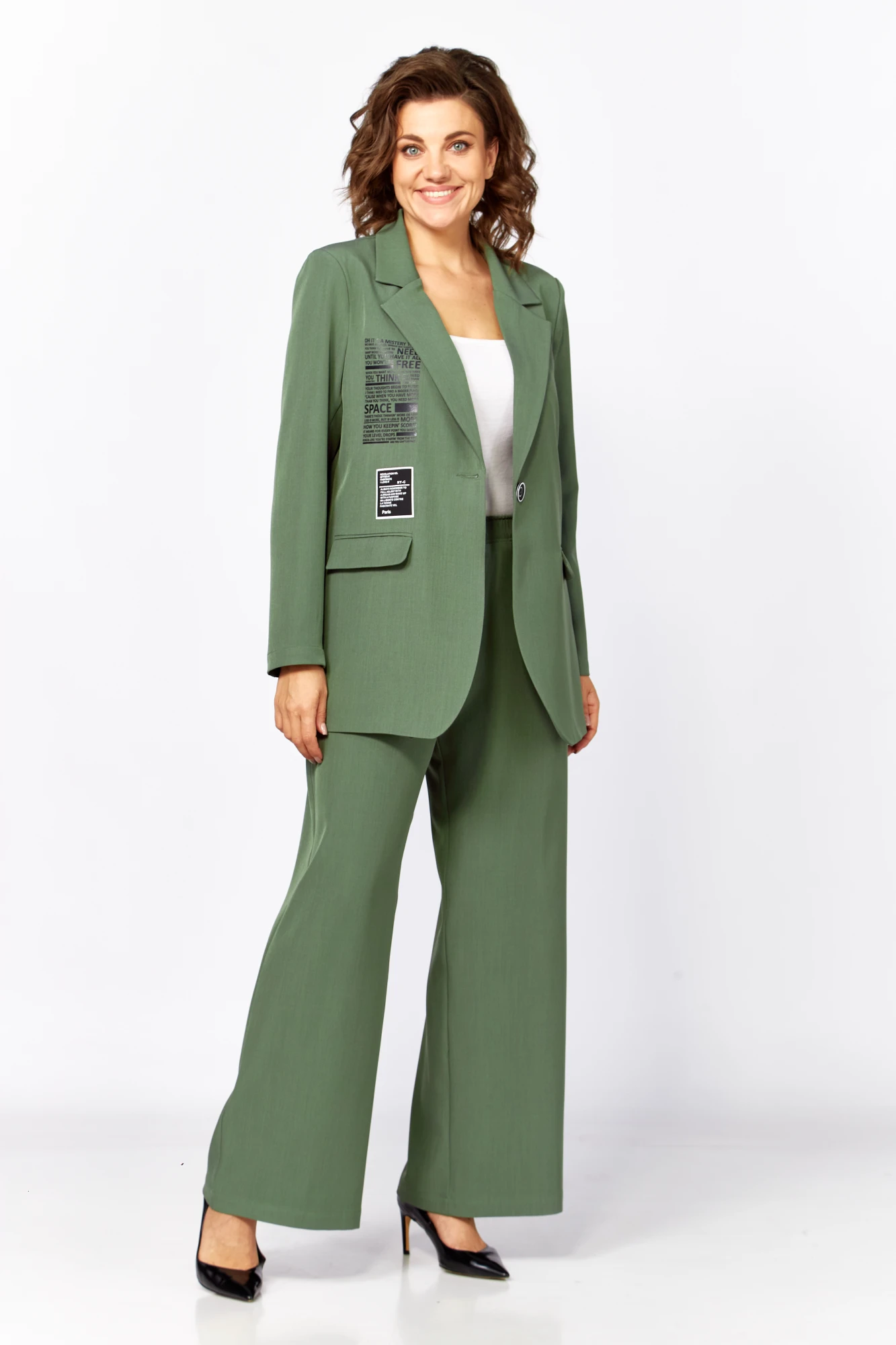 Жакет с центральной застежкой на петли-пуговицы полуприлегающего силуэта. Перед на подкладке, в жакете прорезные карманы с клапаном, воротник пиджачного типа. По переду настрочены декоративные нашивки. Рукав втачной, одношовный с притачной манжетой.