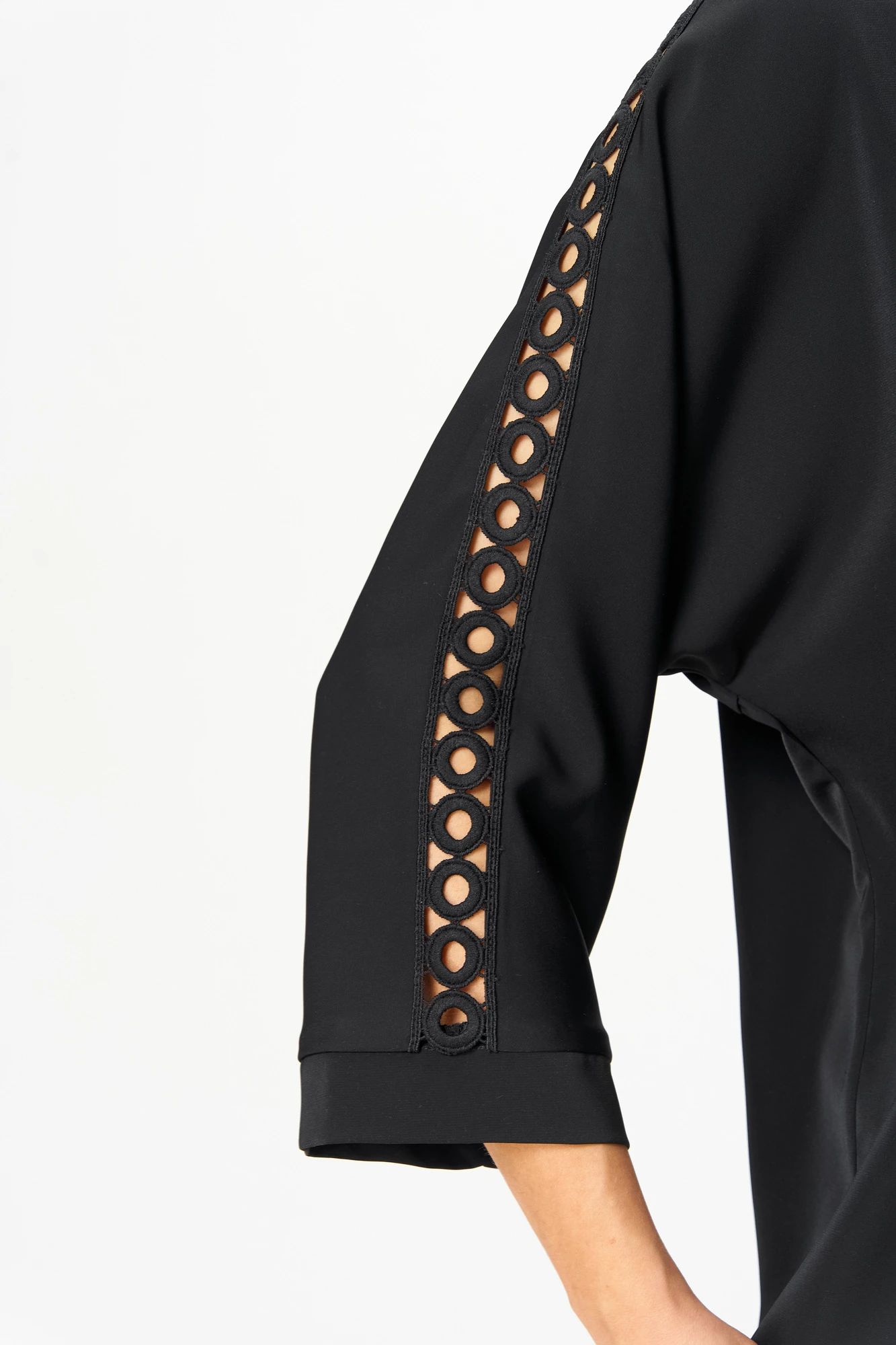 Блуза женская из текстильной ткани. Прямого силуэта. По спинке расположен подрез. В шов вставлено кружево. Рукав 3/4, спущенный с манжетой. По плечевому шву вставлено кружево. Вырез лодочка. Обработан притачной бейкой.