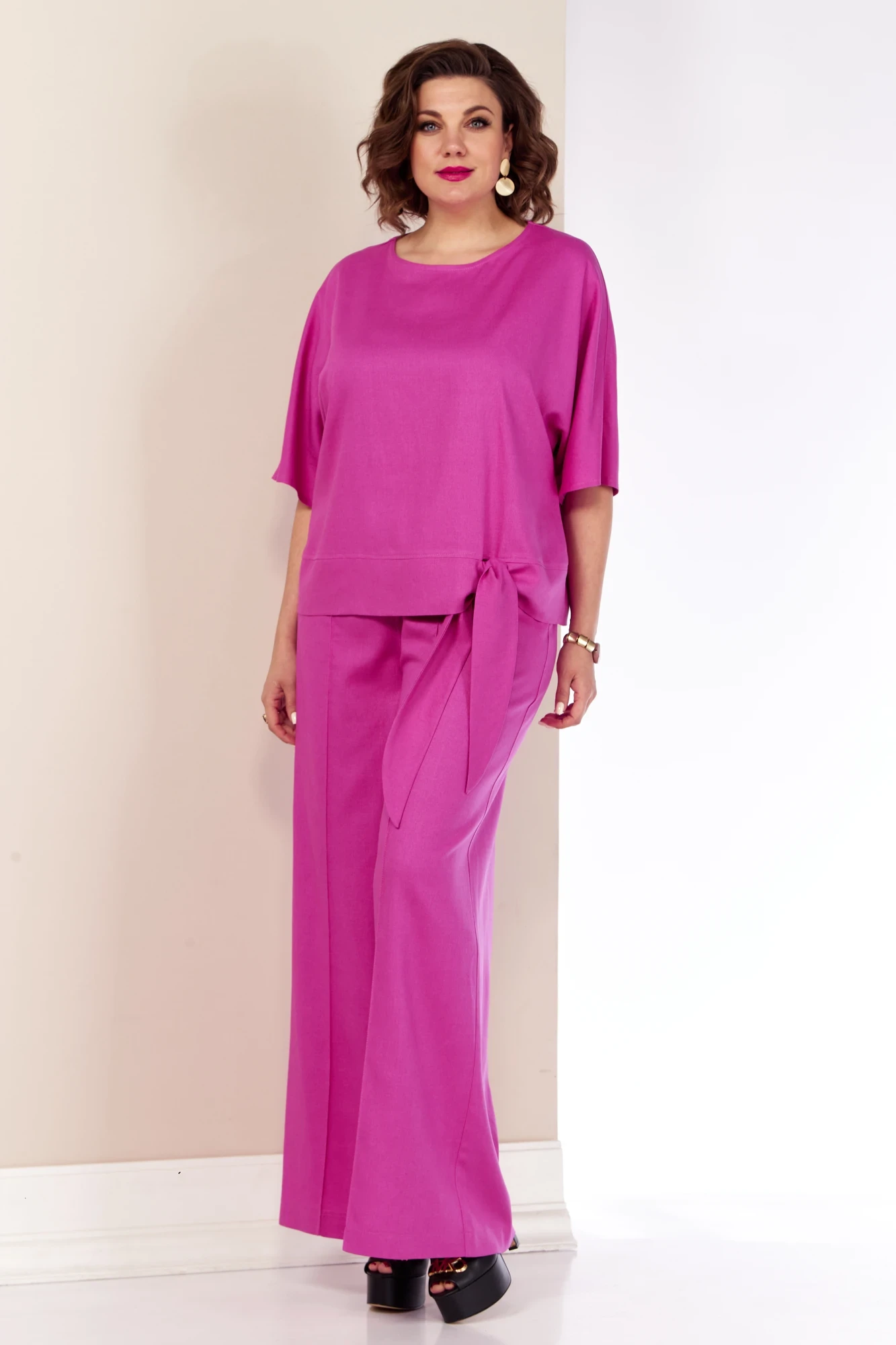 Модный костюм позволит Вам превосходно выглядеть, как на прогулке, так и на торжестве. Оба изделия можно смело комбинировать с другими вещами и обувью Вашего гардероба. Длина брюк по боковому шву с поясом 112 см. Длина блузы по центральному шву спинки с поясом 59 см. Длина рукава от основания шеи 44 см.