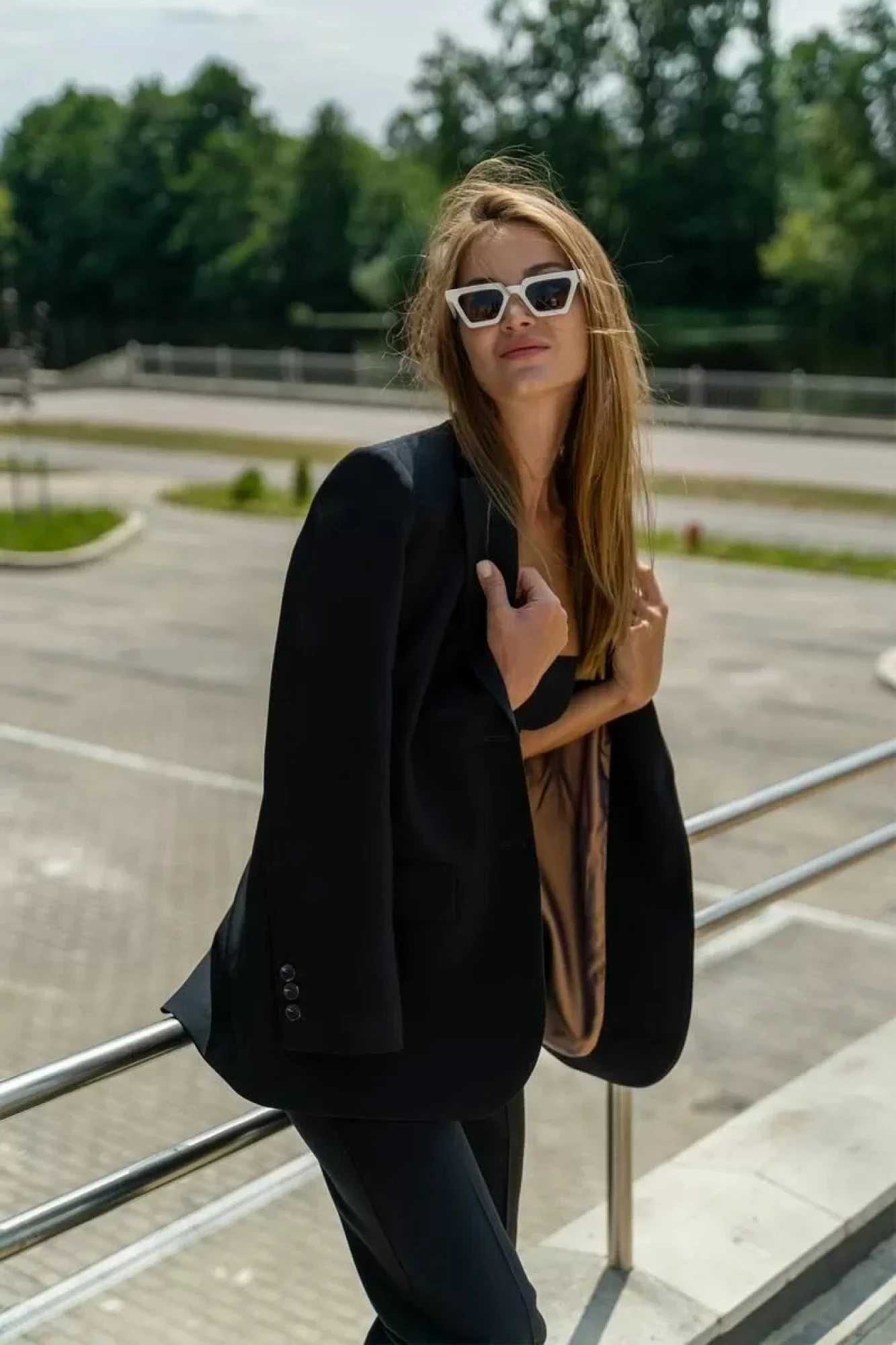 Благородство этого костюма просто зашкаливает. Абсолютно современный look, делает образ острым и элегантным, олицетворяя женщину 21 века