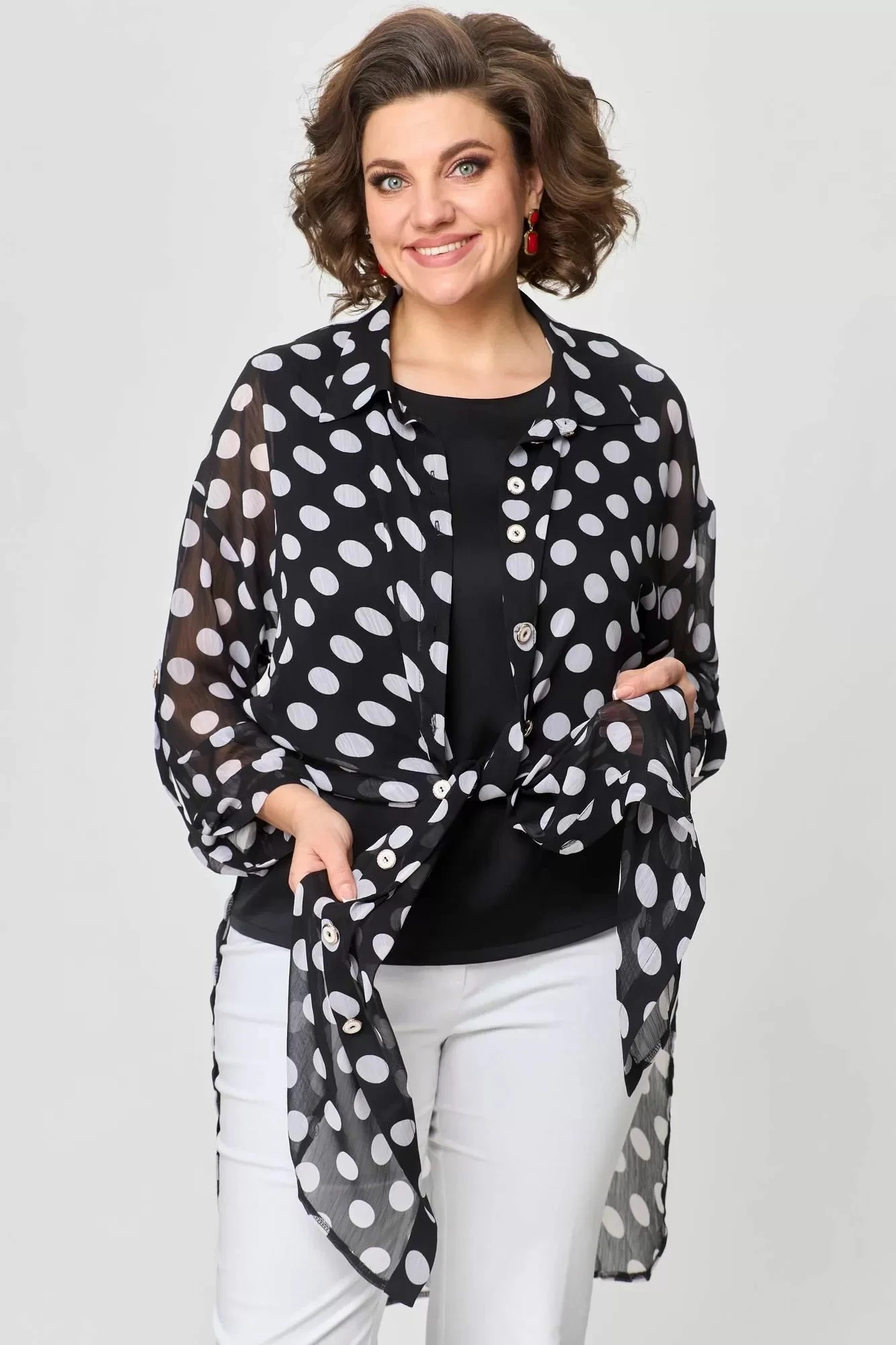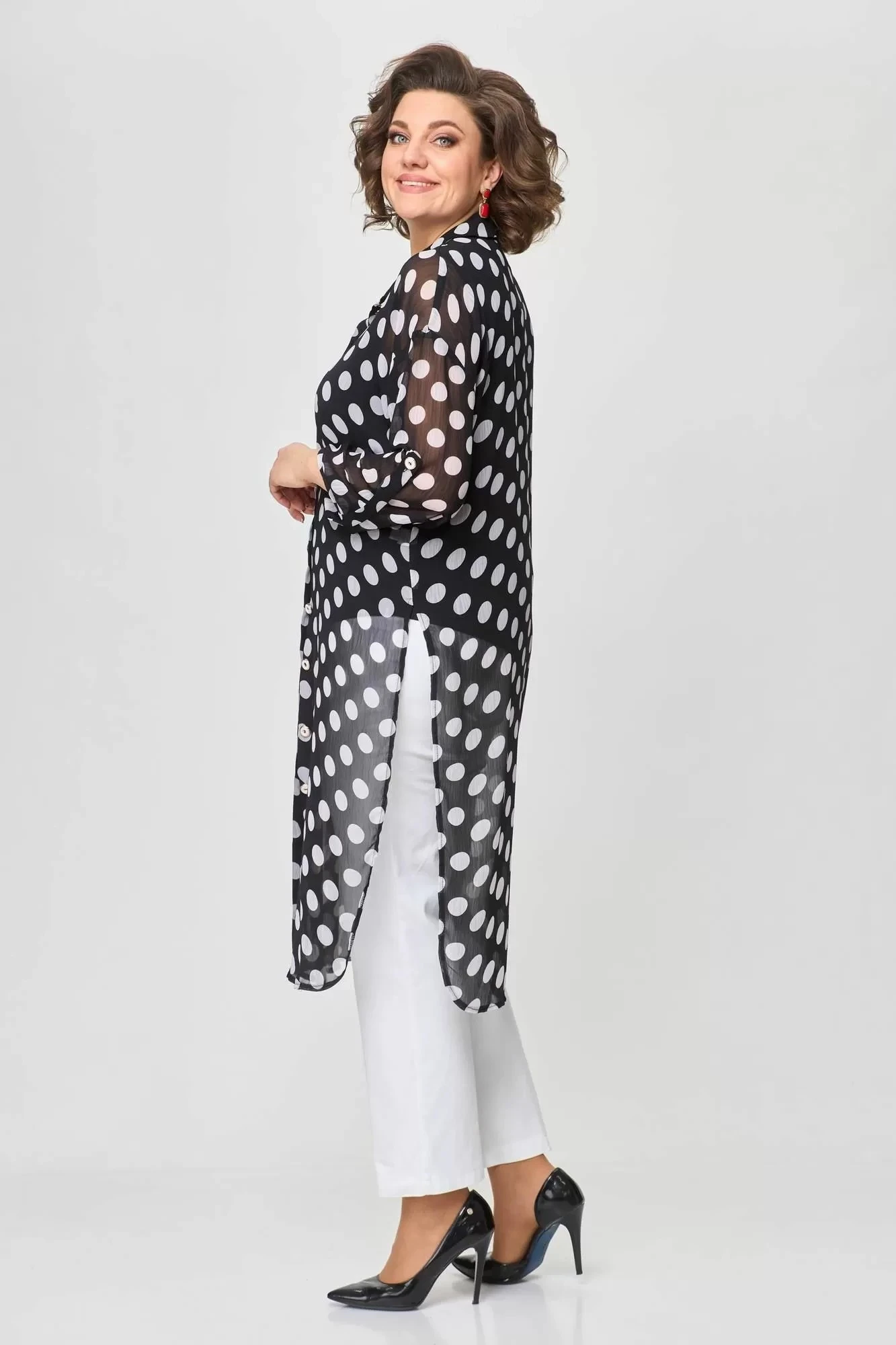 Брюки с поясом, по спинке резинка, застёжка потайная молния и петля пуговица. Топ с полукруглым вырезом и нагрудными вытачками. Рубашка удлинённая ниже колена с фигурными подрезами по бокам. Рукав втачной, длина рукава регулируется патой. Воротник рубашечного типа, застёжка на планке с пуговицами. Рубашку, топ и брюки можно носить отдельно с любыми другими изделиями.