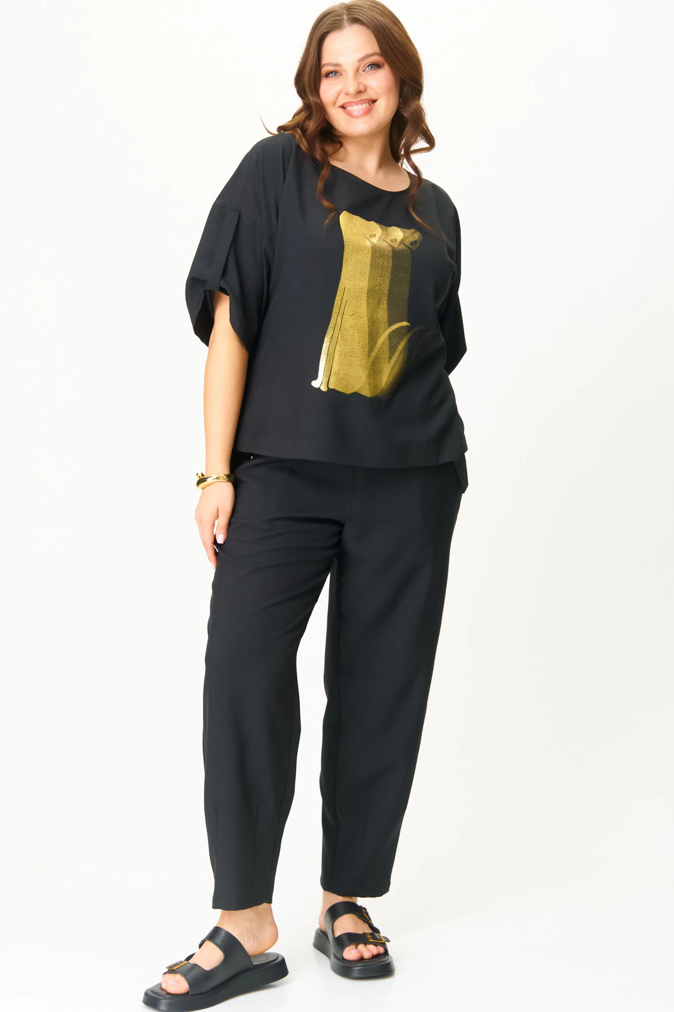 На блузоне выполнена печать фольгой. Брюки с функциональными карманами, пояс на резинке.