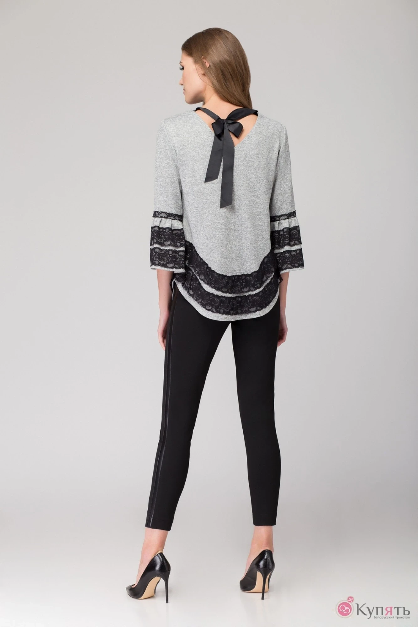 Комплект женский, состоящий из блузки и брюк. Блузка свободного силуэта с фигурным низом. Рукав втачной одношовный длиной ¾ с воланом на сборке. Полочка с нагрудными вытачками. Горловина спинки имеет V-образный вырез. Отделочным элементом блузки служат притачные кружева. Брюки длиной 7/8 заужены книзу. В боковых швах лампасы из отделочной ткани. Пояс брюк широкий трикотажный.