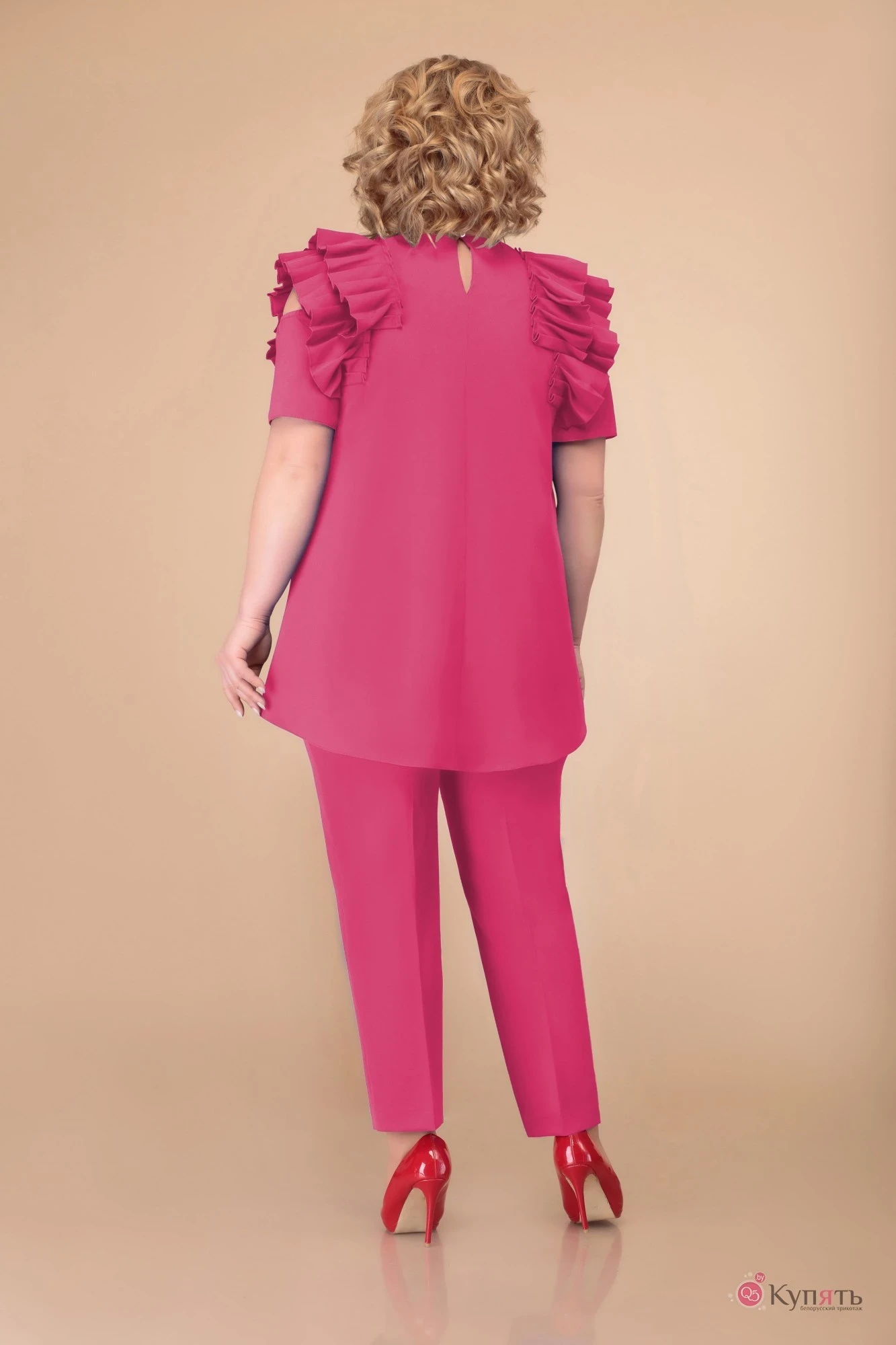 Туника А-силуэта. Рукав короткий без верхней части оката. Для лучшего прилегания в верхней части рукава вставлена резиновая тесьма. Низ туники фигурной формы с удлинением на спинку. В области плечевого пояса отделочные детали.
