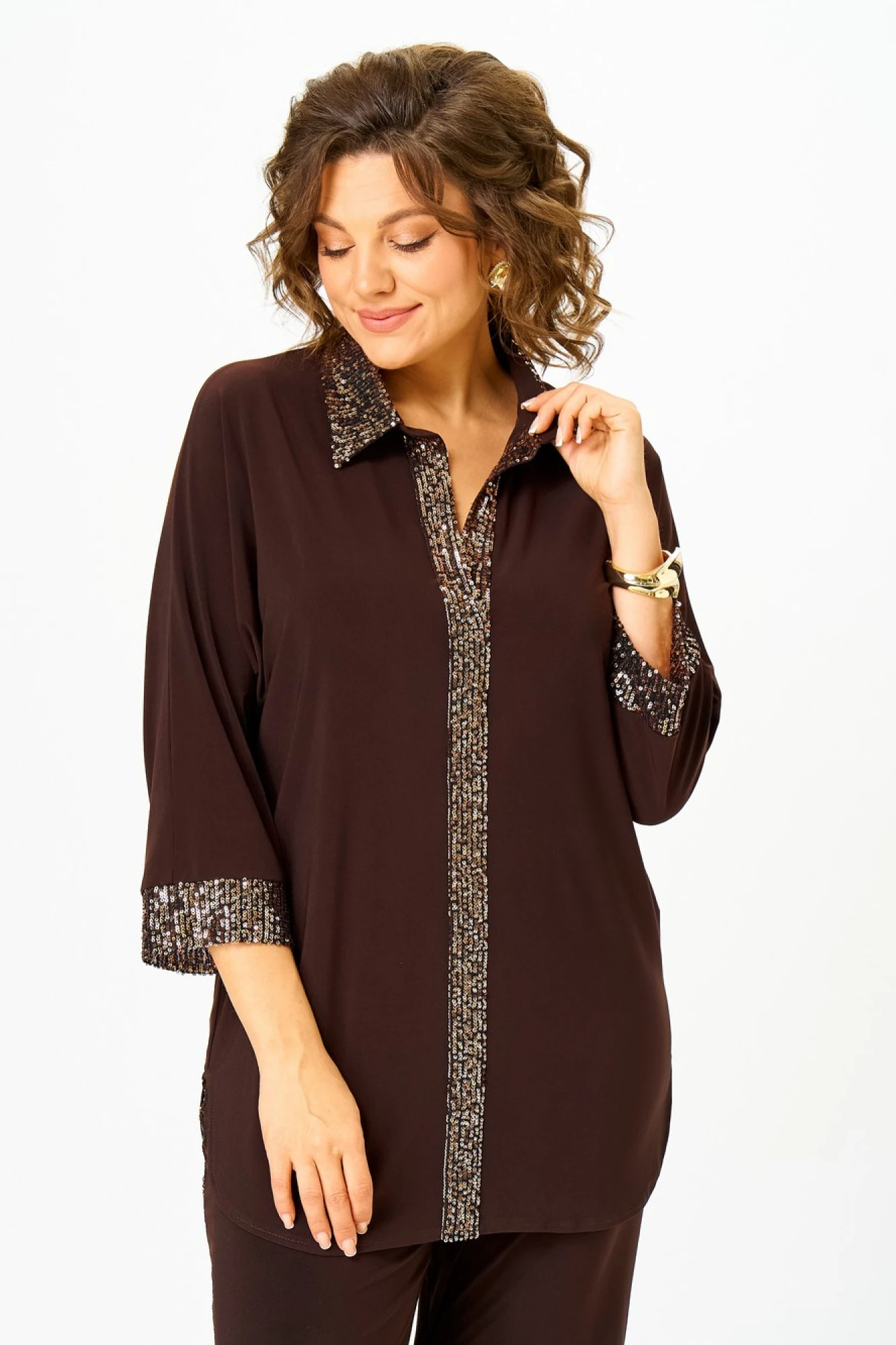 Блузка прямого кроя, с цельнокроеным рукавом. Горловина с воротником на стойке. Декоративная планка по центру переда. По низу рукава манжета. Низ блузки фигурный.