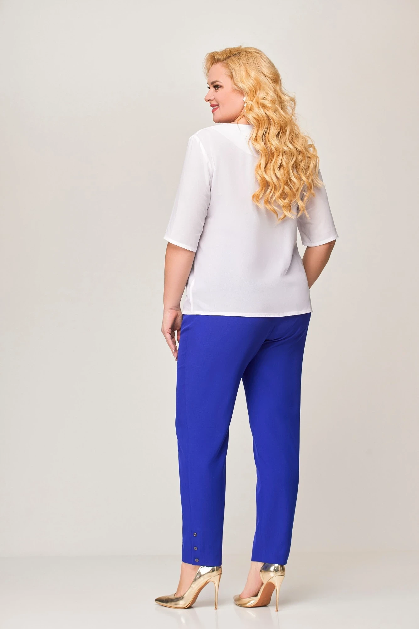 Брюки прямые, слегка заужены к низу, по переду обработаны карманы с отрезными бочками. Пояс притачной с резинкой по спинке. По низу брюк в боковом шве обработана декоративная шлица, с 3-мя декоративными пуговицами.