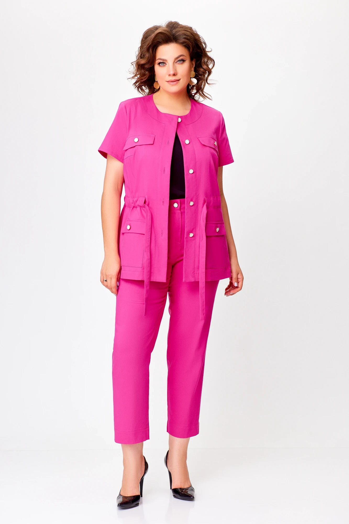 52, 54 ,56, 58 ,60, 62Жакет прямого силуэта без подкладки, с центральной застёжкой на петли и металлические пуговицы. Полочка с нагрудными вытачками и настрачными клапанами в области груди, в области бёдер расположены накладные карманы с клапанами, застёгивающиеся на петлю и пуговицу. Спинка со средним швом. По линии талии расположена кулиса с завязывающимся поясом. Горловина круглая, рукав втачной, короткий.