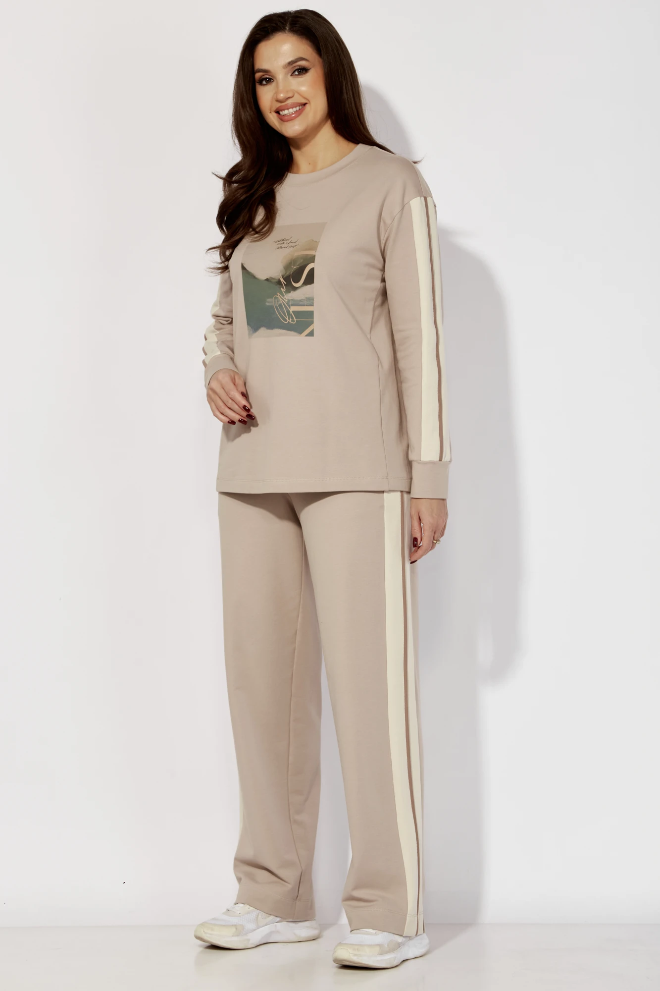 Свитшот прямого силуэта с отрезными бочками. Рукав длинный, со спущенной линией плеча, снизу на манжете. Горловина круглой формы с подрезной бейкой. Перед задекорирован принтом. Брюки прямые с карманами в боковых швах. По низу небольшой разрез. Пояс притачной с резинкой(по центру гладкий)По бокам брюк и по центру рукавов втачные отделочные лампасы с контрастным кантом. Жилет выполнен из плащевки на синтепоне(vs100) на подкладке, прямого силуэта. По переду рельефы из пройм в боковой шов. В рельефах карманы с отделочными деталями в форме клапана. Застежка центральная на тесьму "молния" Горловина оформлена капюшоном со стойкой и кулисой. По спинке фигурные рельефы. Центральная часть с отделочной деталью и декоративной нашивкой. Низ жилета по спинке чуть длиннее.
