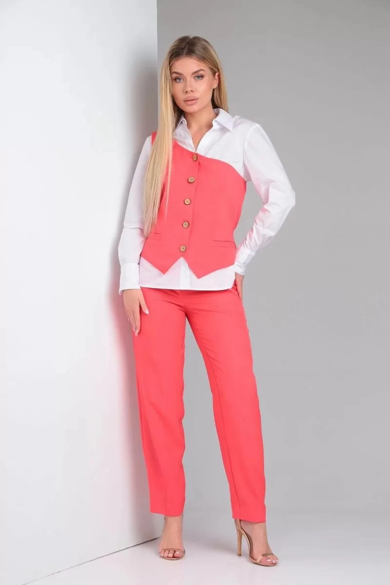 Брюки из костюмной ткани свободного силуэта, с карманами в боковых швах, вытачками на переднем и заднем полотнищах по низу, с гульфиком и застежкой «молнией», на поясе с застежкой на крючки. Блузка из ткани с хлопком прилегающего силуэта с V-образным вырезом, отложным воротником на стойке, застежкой на петли-пуговицы. Перед с нагрудными и талиевыми вытачками, притачной планкой. Спинка с кокеткой и рельефными швами. Рукав втачной одношовный с притачной манжетой и застежкой на петли и пуговицы.