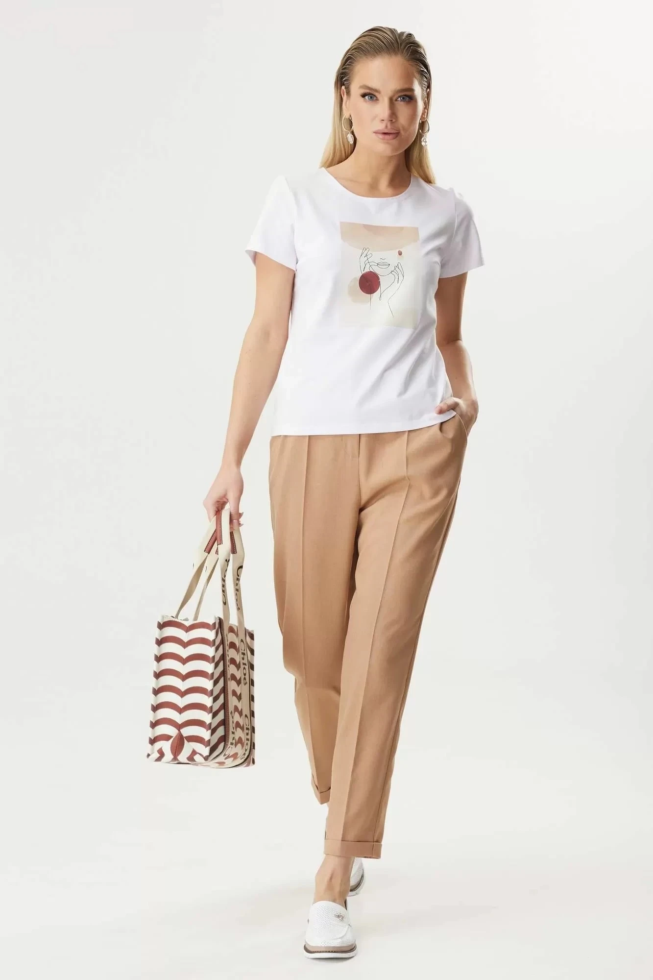 Брюки классической формы, зауженные к низу со стрелками по передним и задним половинкам. По низу брюк манжеты. Верхний срез брюк обработан поясом с резинкой по боковым швам. На задних половинках расположены талиевые вытачки, в боковых швах – наклонные карманы. Перед обработан поясом фигурной формы и декоративным клапаном, на котором пришита пуговица. Блуза выполнена из хлопкового трикотажного полотна прямого силуэта. Она дополнена нагрудными вытачками и коротким втачным рукавом. По переду майки расположен стильный принт, который подчеркнет уникальность образа.
