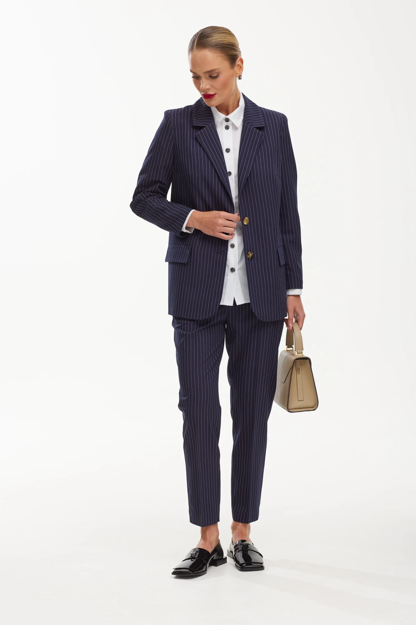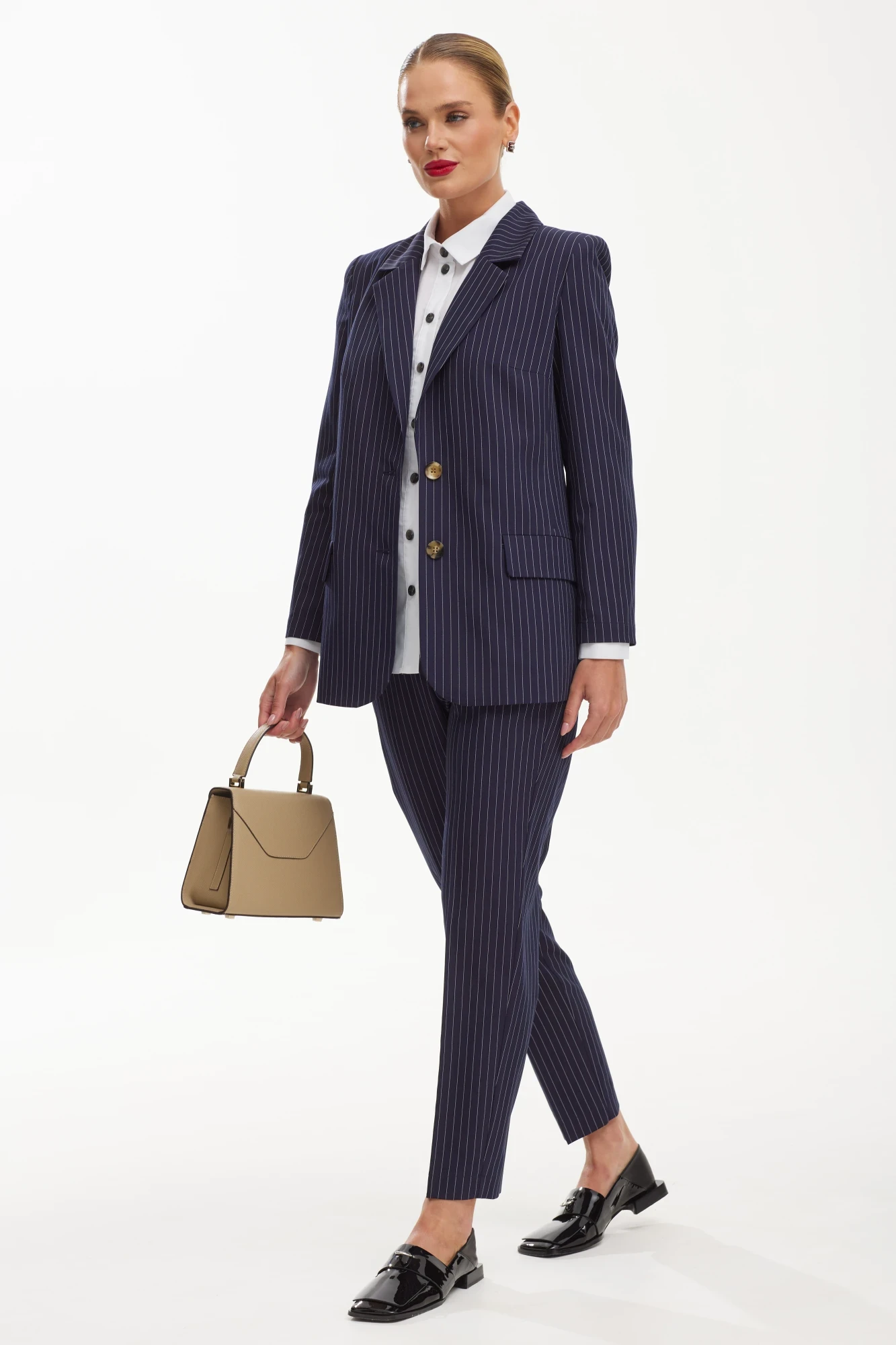50,52,54, 56Данный комплект сшит из высококачественной ткани темно-синего цвета, в полоску. Жакет удлиненный, прямого кроя, прикрывающий линию бедра. Он отлично корректирует фигуру, зрительно добавляя рост и грациозность внешнему виду. Брюки классического фасона, с завышенной талией. Сзади для удобства и комфорта вставлена резинка. Данная модель будет отлично сочетаться с обувью на каблуке, делая образ элегантным. Для более формальных мероприятии и повседневных образов можно сочетать с более комфортной обувью, без каблука.