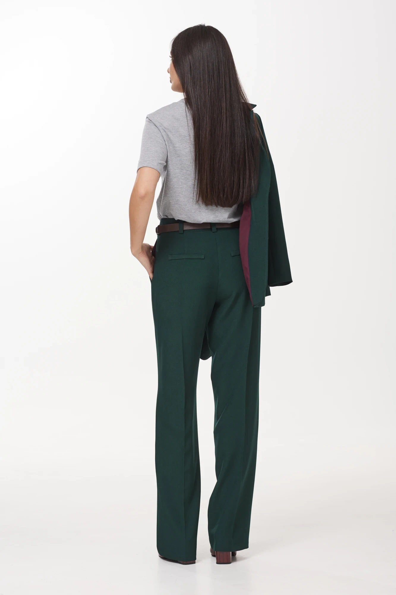 Брюки классической формы, прямого силуэта, со стрелками по передним и задним половинкам. Верхний срез обработан обтачным поясом. На задних половинках расположены талиевые вытачки и настрочены декоративные листочки. В боковых швах брюк обработаны наклонные карманы. Застёжка центральная на тесьму молнию и крючок.