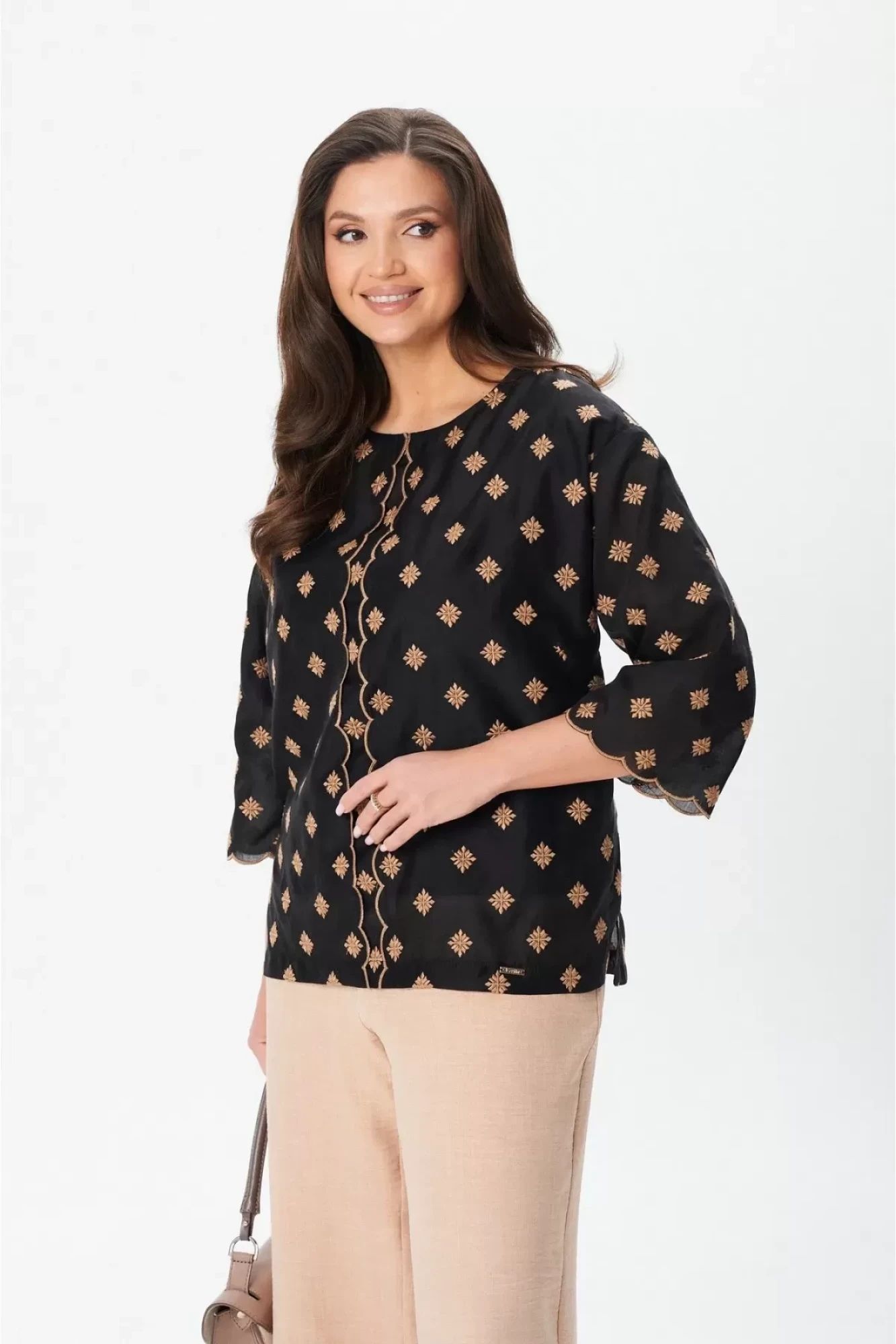 Брюки прямого кроя на поясе с резинкой. В боковых швах карманы.