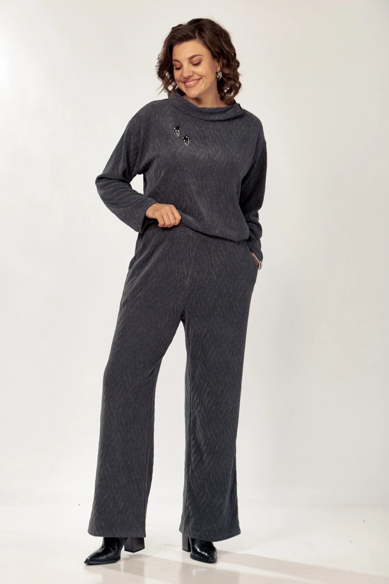 Брюки прямые. На поясе с резинкой. В боковых швах карманы.