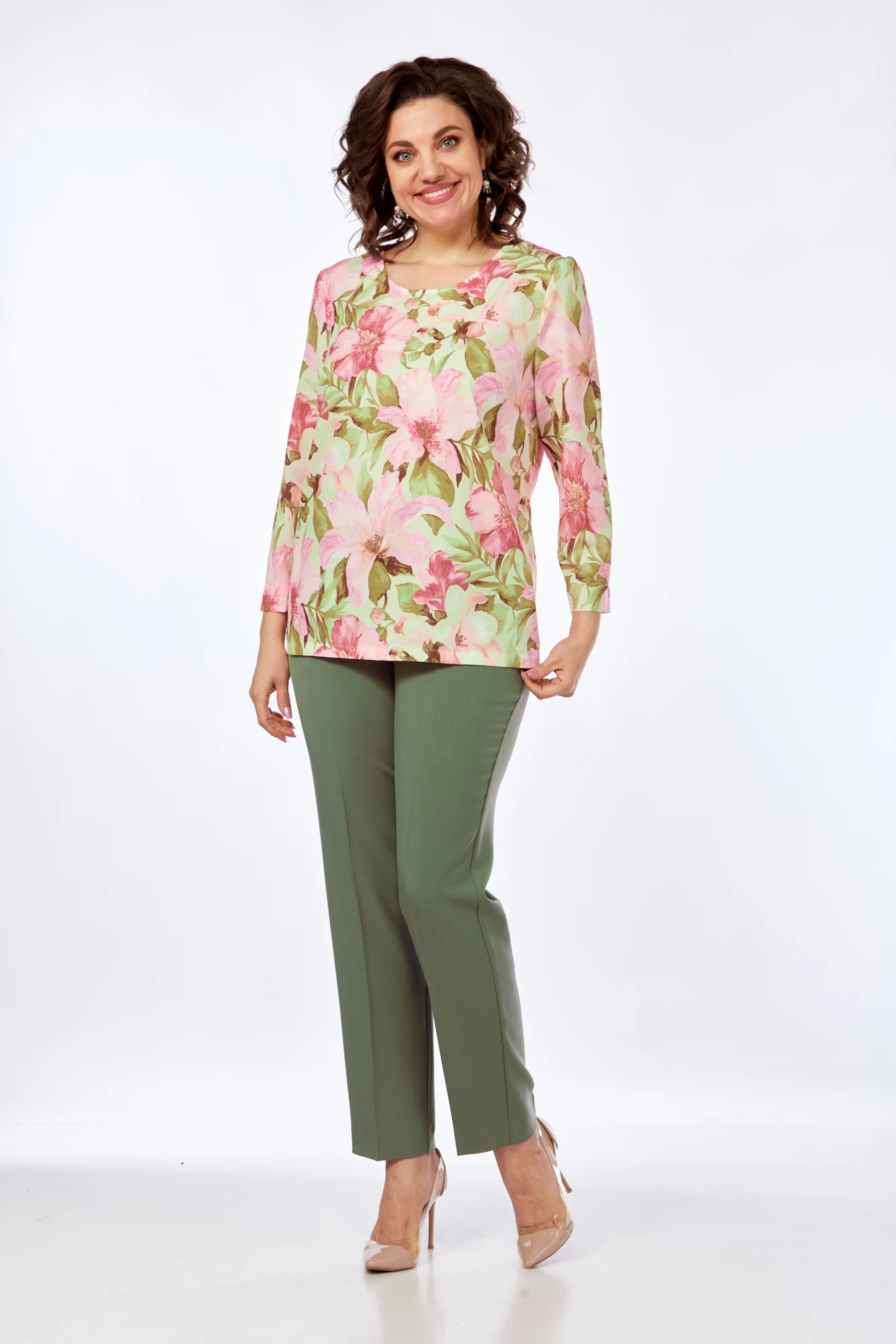 Брючный костюм Vilena Fashion 999 полынь_ розовые цветы тройка