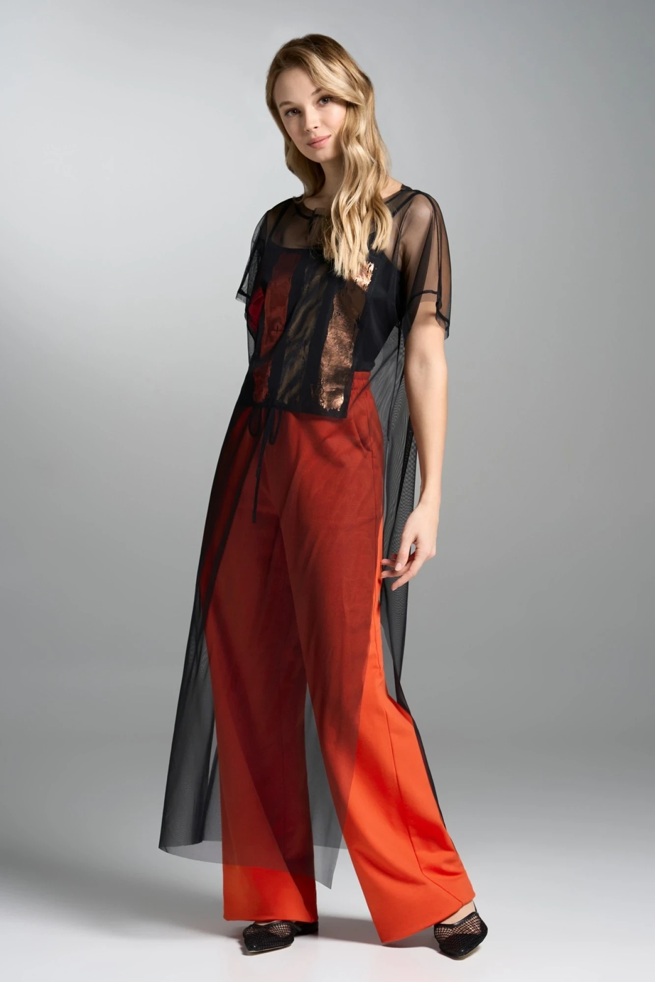 50,52В боковых швах высокие разрезы. По переду, с изнанки, настрочная деталь с декоративной авторской печатью.