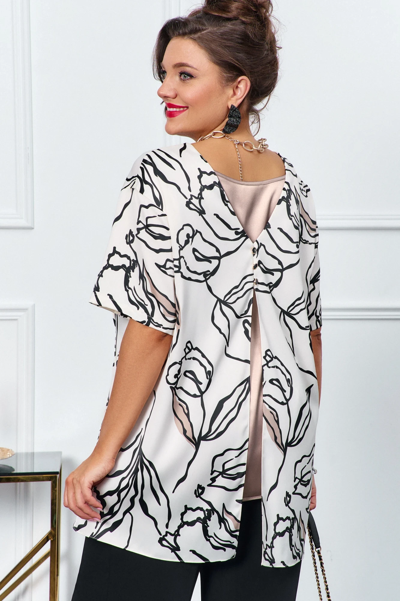 Блузка нижняя - свободного силуэта с округлой формой горловины, нагрудными вытачками по переду блузки. Низ блузки ассиметричный, фигурной формы с разрезами в боковых швах.