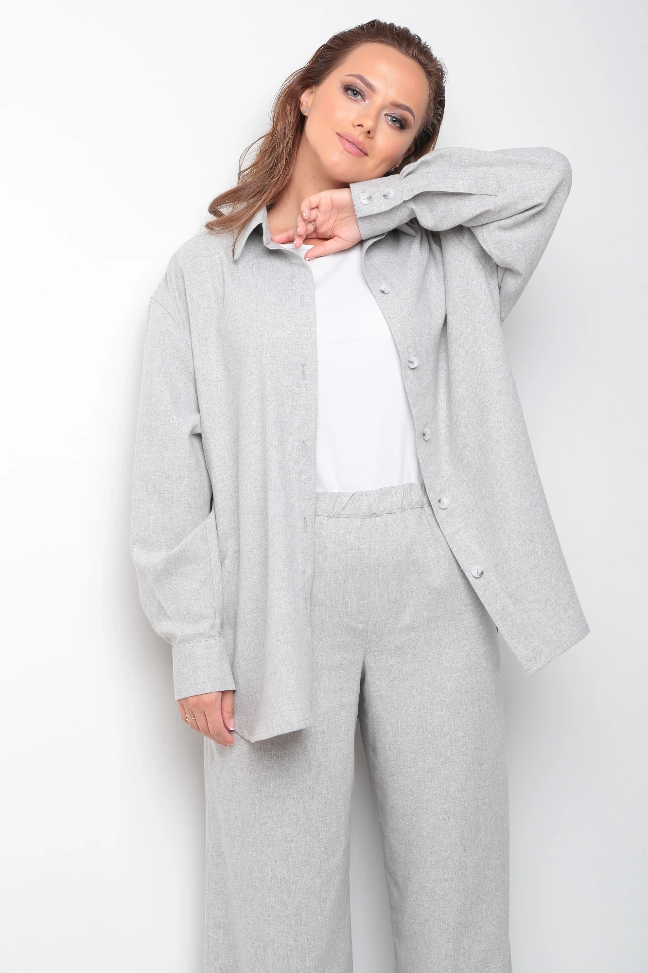 44,46, 48 ,50,52,54Длина рукава от горловины для роста 164 см 73 см, для роста 170 см 75 см. Воротник отложной на стойке. Застежка пуговицы. Низ рубашки фигурный. Длина изделия от плеча для роста 164 см 73 см, для роста 170 см 76 см. Брюки свободные, пояс на широкой резинке. По переду имитация «застежка-гульфик». По бокам брюк расположены карманы. Длина брюк от пояса для роста 164 см 104 см, для роста 170 см 106 см.