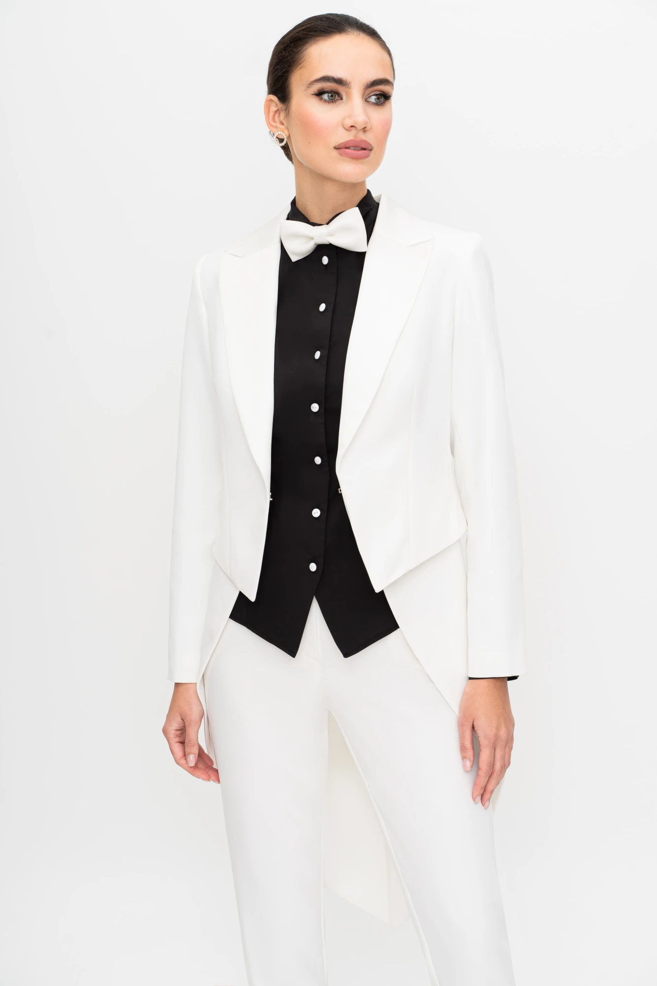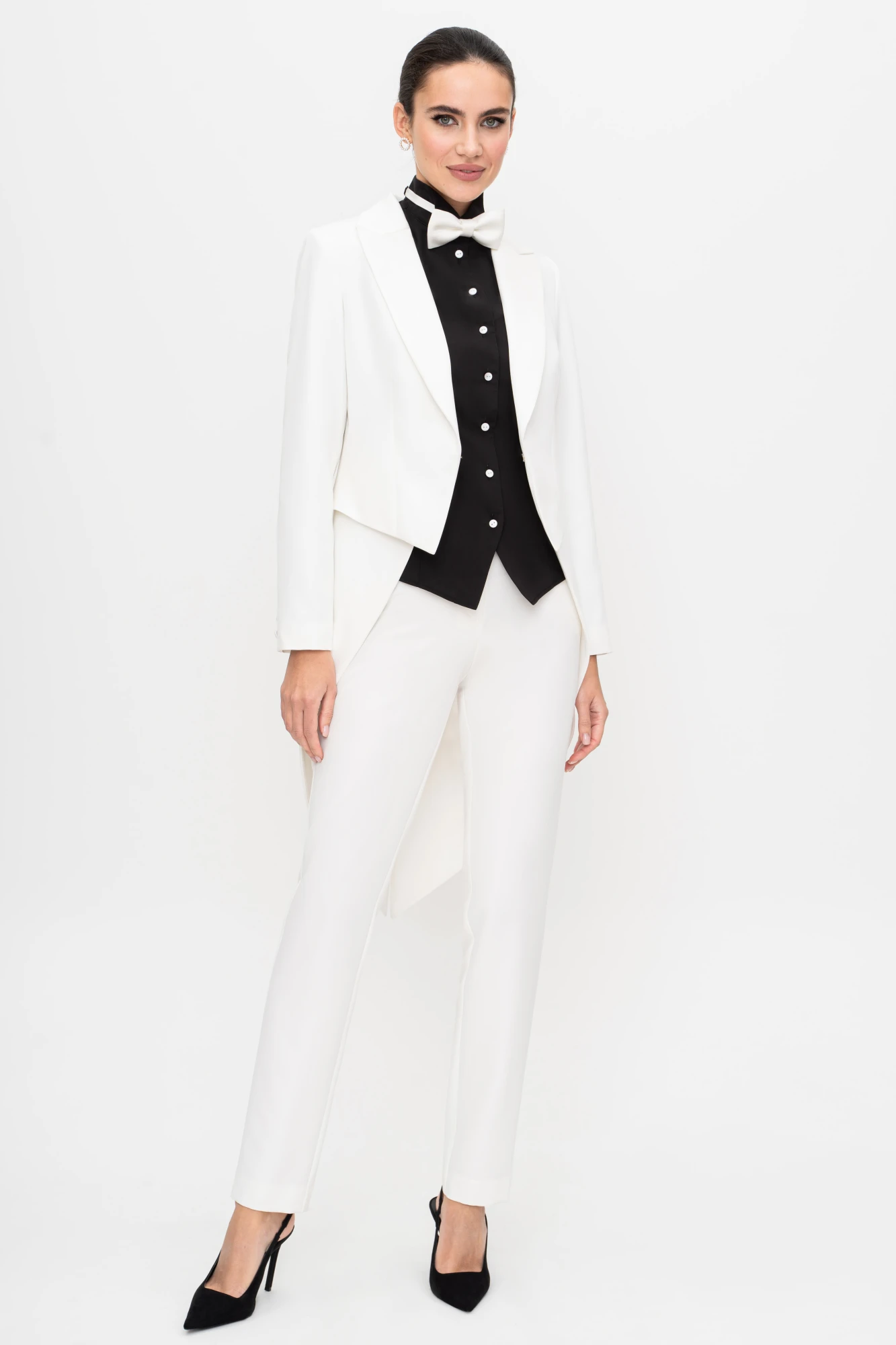 42, 44 , 46 , 48Костюм женский трёхпредметный, состоящий из фрака, блузы и брюк. В комплекте к костюму идёт галстук-бабочка.