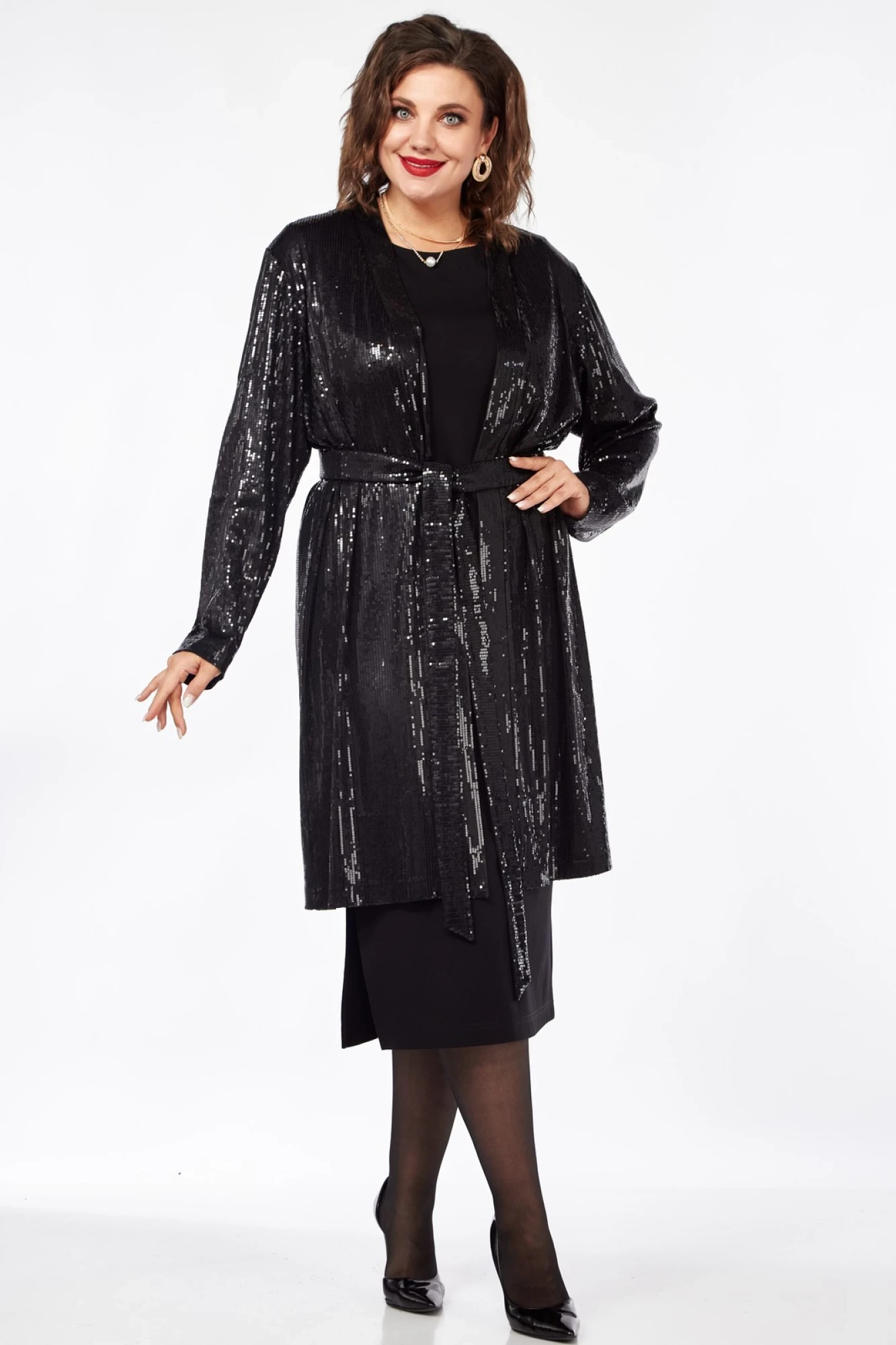 Кардиган женский, выполненный из ткани в пайетки, без застежки, который будет незаменимым предметом гардероба в период новогодних праздников. Кардиган прямого свободного силуэта с поясом. Спинка без конструктивных элементов. Рукава втачные.