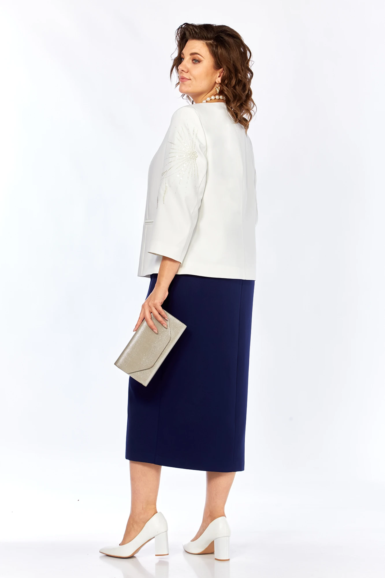 Длина жакета по спинке — 61 см, длина плеча — 11 см, длина рукава — 49 см.