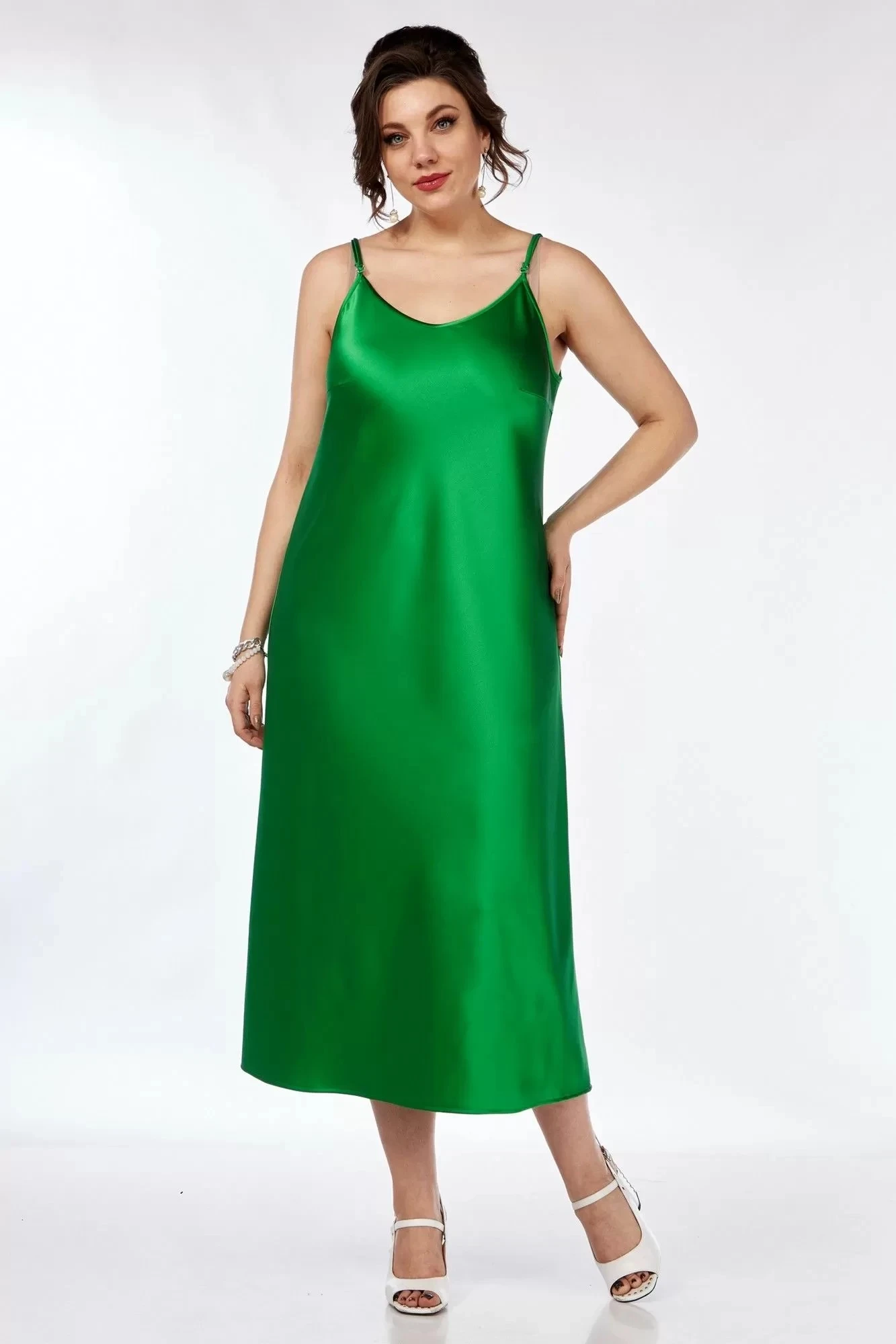Платье полуприлегающего силуэта, из плотной атласной ткани. Длина миди, с нагрудными вытачками из боковых швов и с округлым вырезом горловины по переду и спинке, на тонких регулирующихся бретелях. Жакет женский, на подкладке, спинка со средним швом. Застежка жакета на 1 петлю и пуговицу. Перед с нагрудными вытачками из боковых швов, и прорезными карманами с клапанами и рамками. Воротник пиджачный, линия конца воротника выходит за линию уступа лацкана, образуя эффект - внахлест. Рукав втачной 2-х шовный, длиной 3/4. Рукав с широкой отложной манжетой на пату и пуговицу.