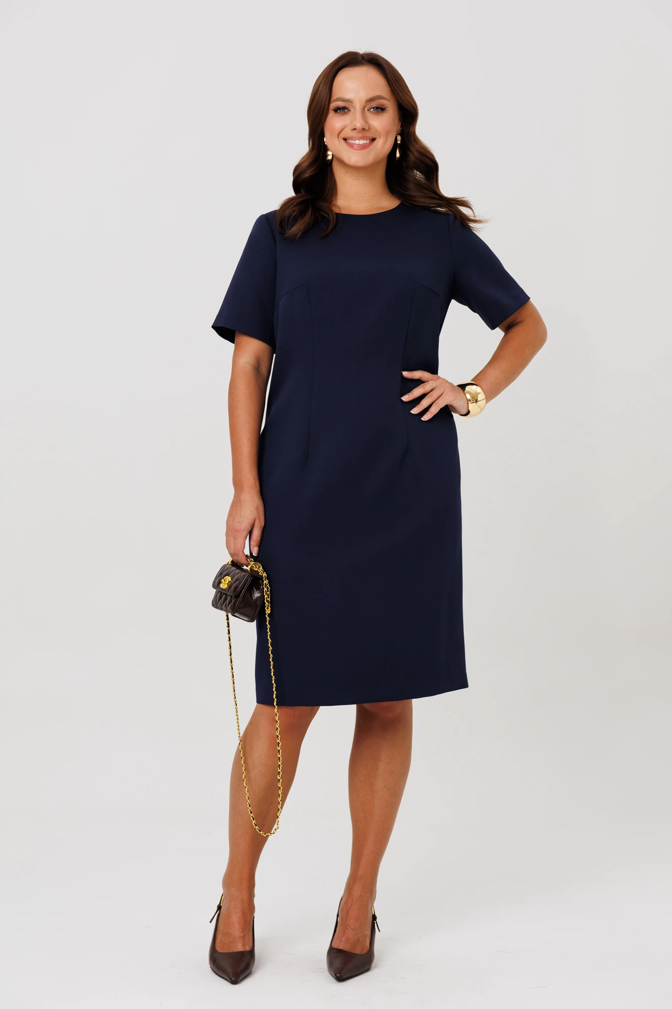 50, 52 , 54 , 56 , 58 , 60 , 62Платье из костюмно-плательной ткани (чуть тянется) полуприлегающего силуэта без подкладки, по переду нагрудные и талиевые вытачки. Спинка со средним швом и шлицей, застежкой – молнией и талиевыми вытачками, рукава втачные, одношовные. Горловина оформлена вырезом округлой формы.