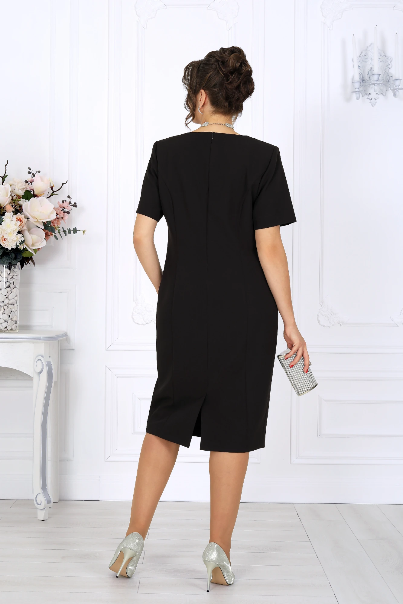 Платье классической длины с утончённой формой выреза придают образу элегантность, а продуманная конструкция со шлицей на спинке гарантирует свободу движений.