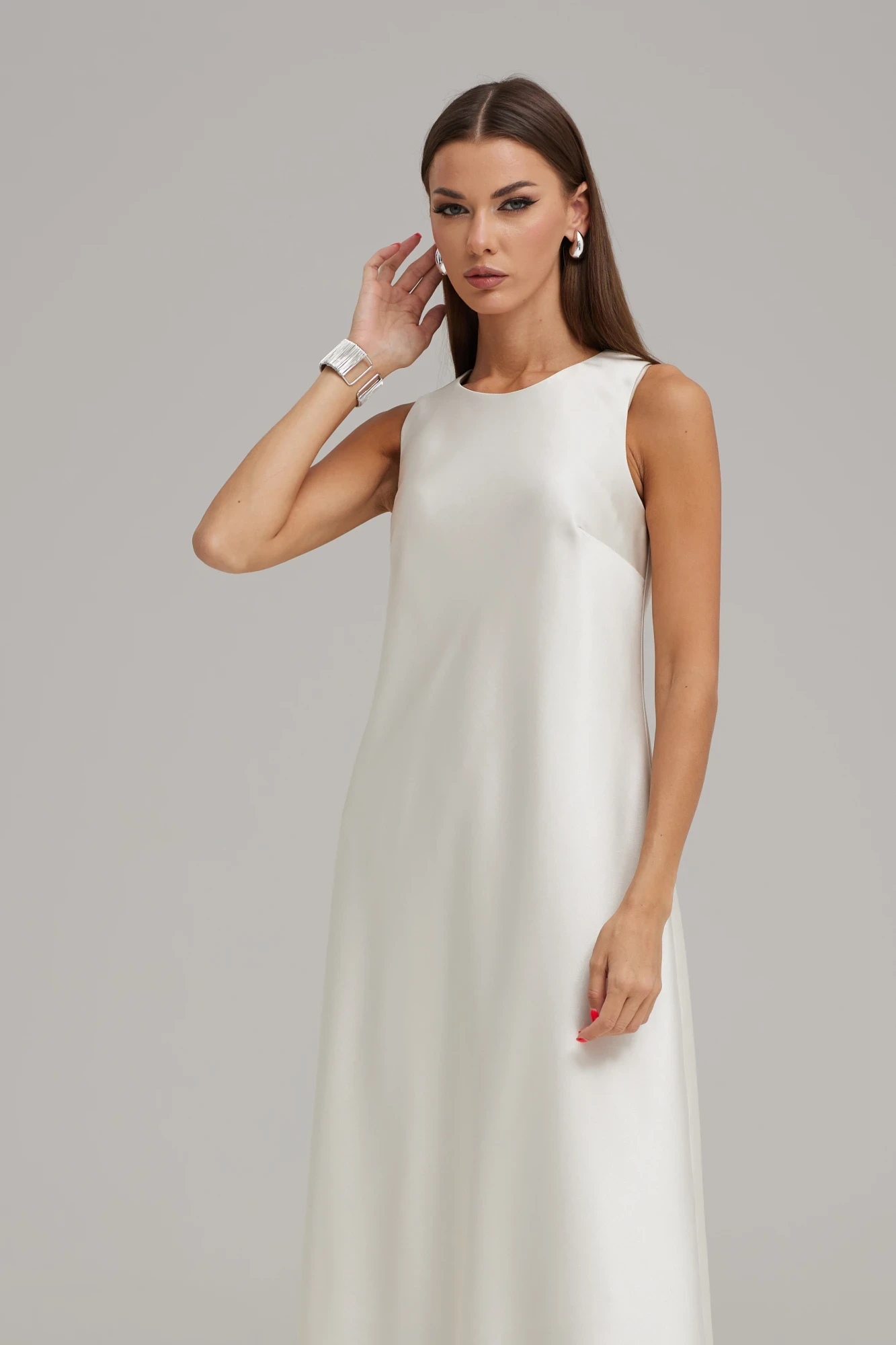 Платье с американской проймой, полуприлегающего силуэта. Платье выполнено из атласной струящейся ткани, покроено по косой. Горловина округлой формы, по спинке с застежкой на пуговицу. По переду расположены нагрудные вытачки, на спинке – талиевые вытачки. Платье с трикотажной подкладкой.