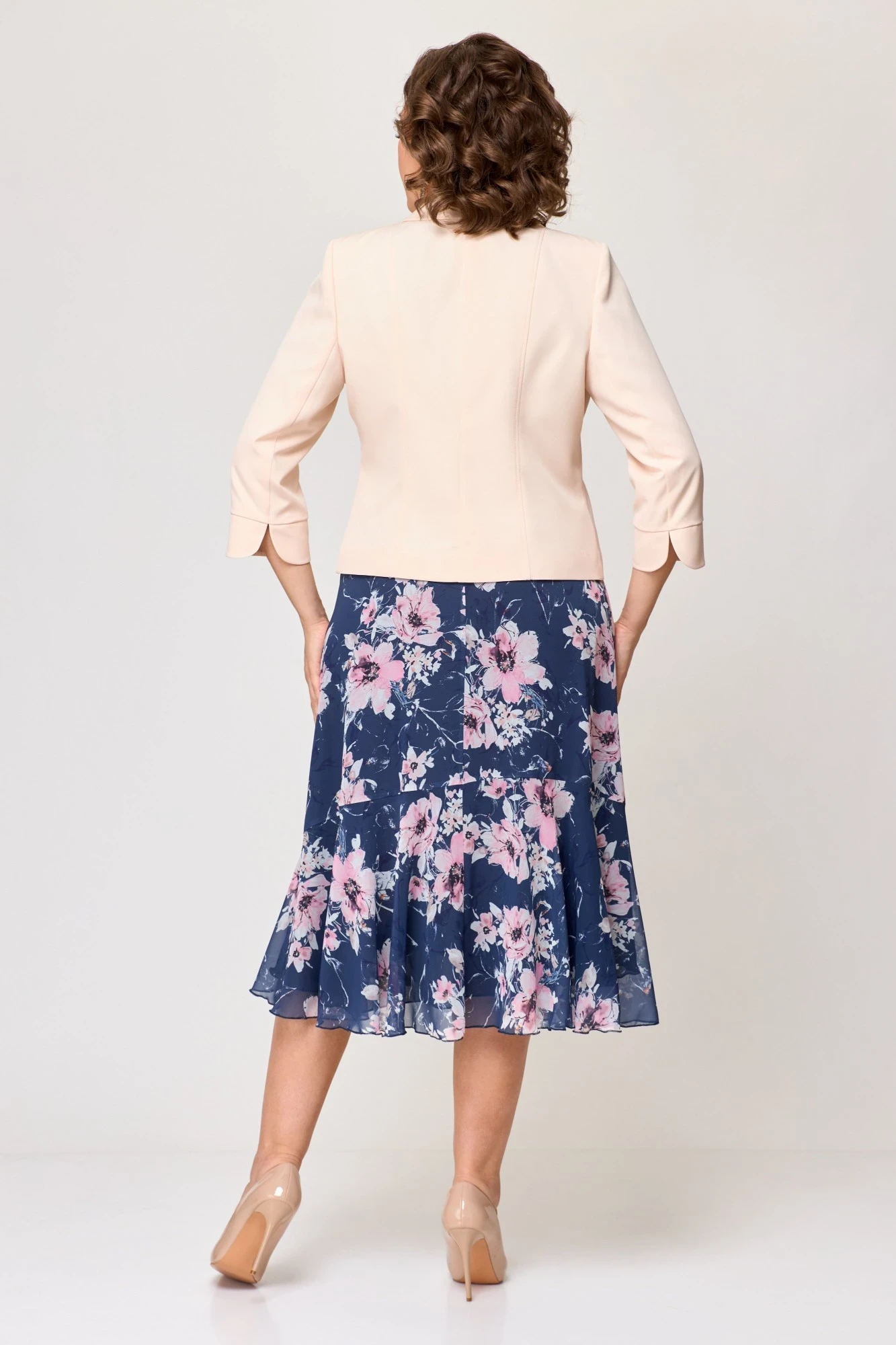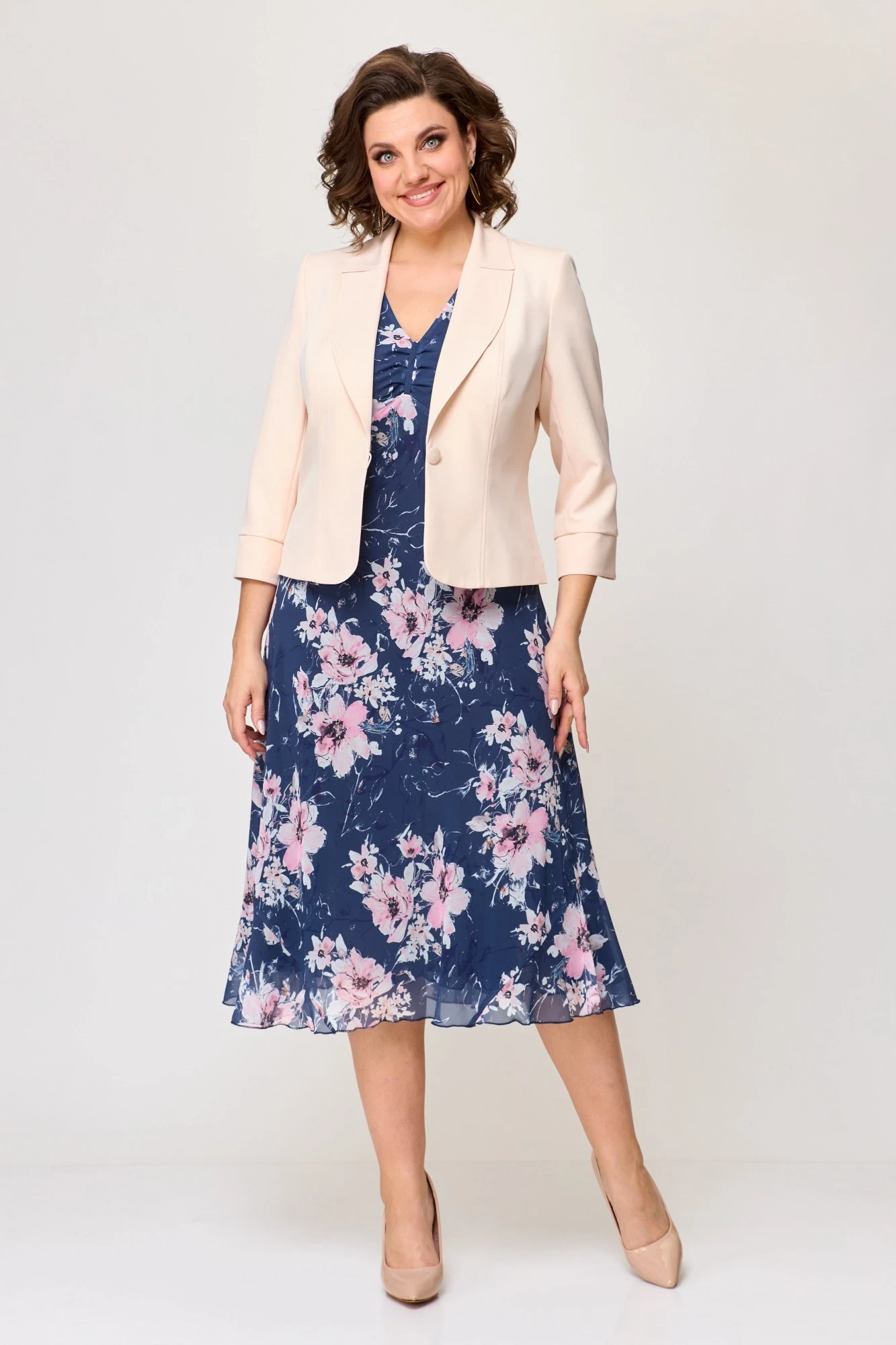 Костюм с платьем СлавияЭлит 166 двойка синее + магнолии, жакет пудровый