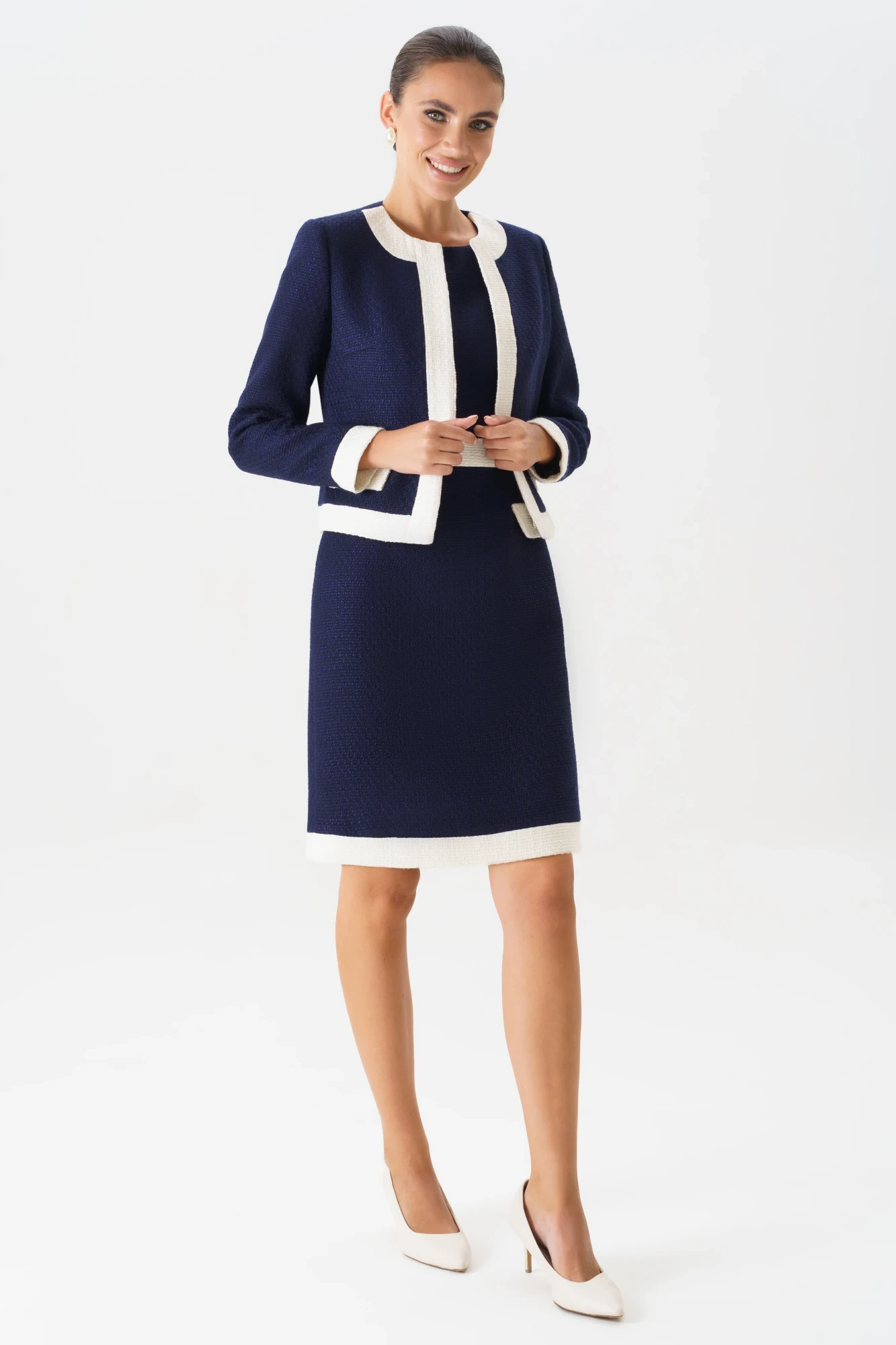 44,46,48,50,52, 54Костюм женский из костюмной фактурной ткани с отделочными деталями контрастного цвета, состоит из жакета без застежки и платья с коротким рукавом.