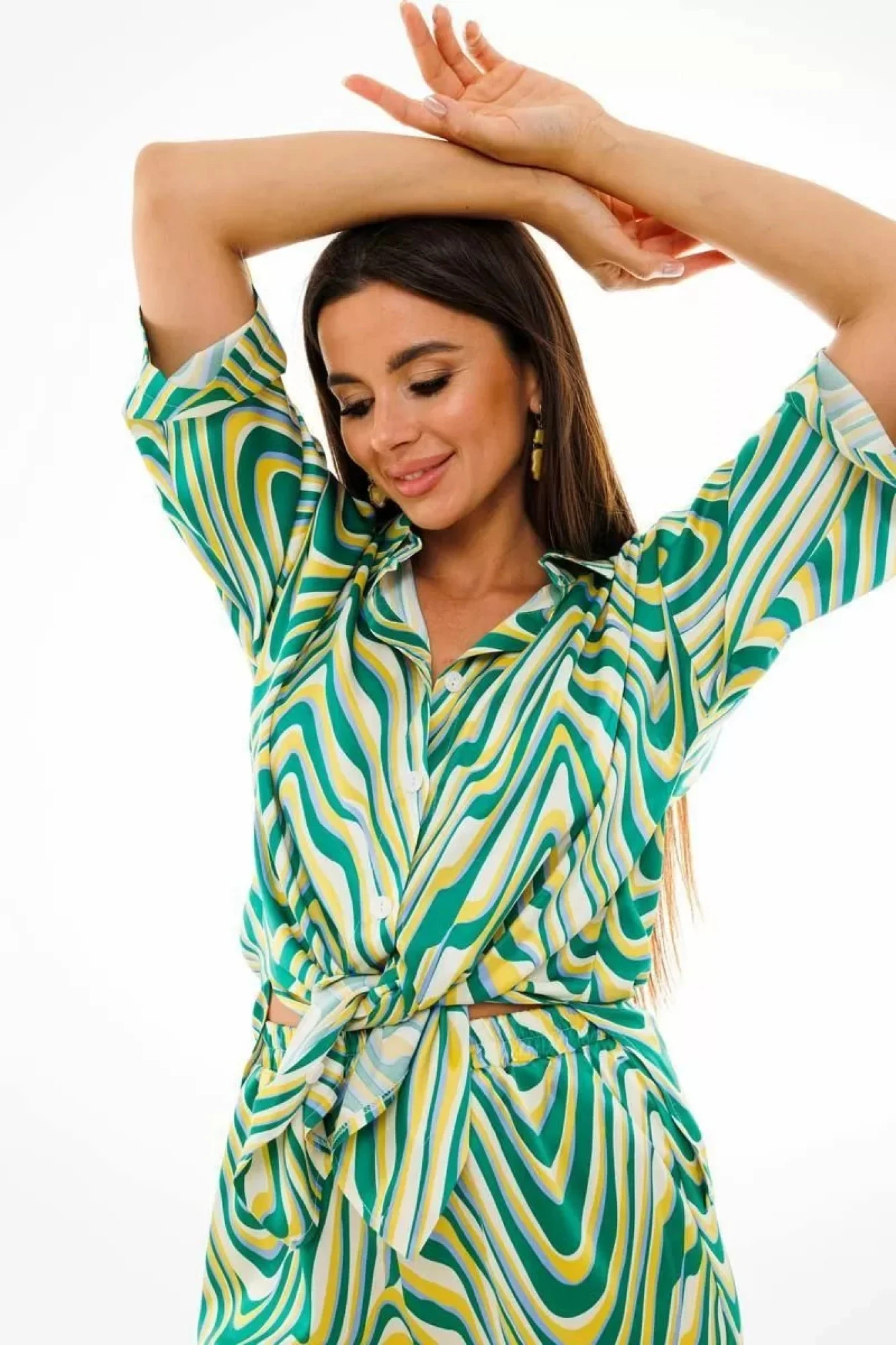 Рубашка имеет привлекательную яркую расцветку, которая напоминает сочные цвета лета. Она добавит игривости и свежести в образ. Важной особенностью этой рубашки являются рукава на пате, которые можно зафиксировать, сделав их короче. Это позволит тебе настроить длину рукавов в соответствии с твоим предпочтением.