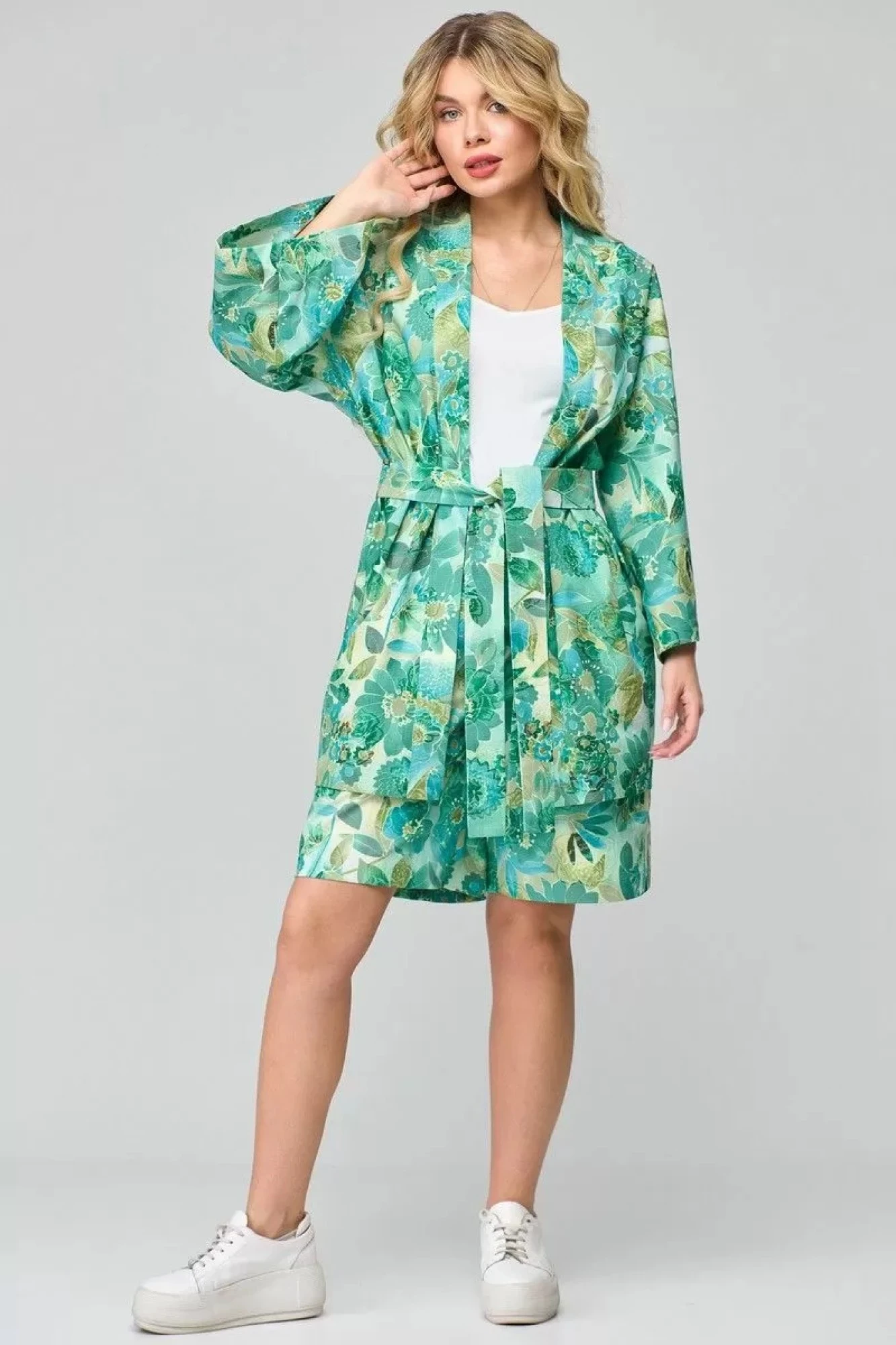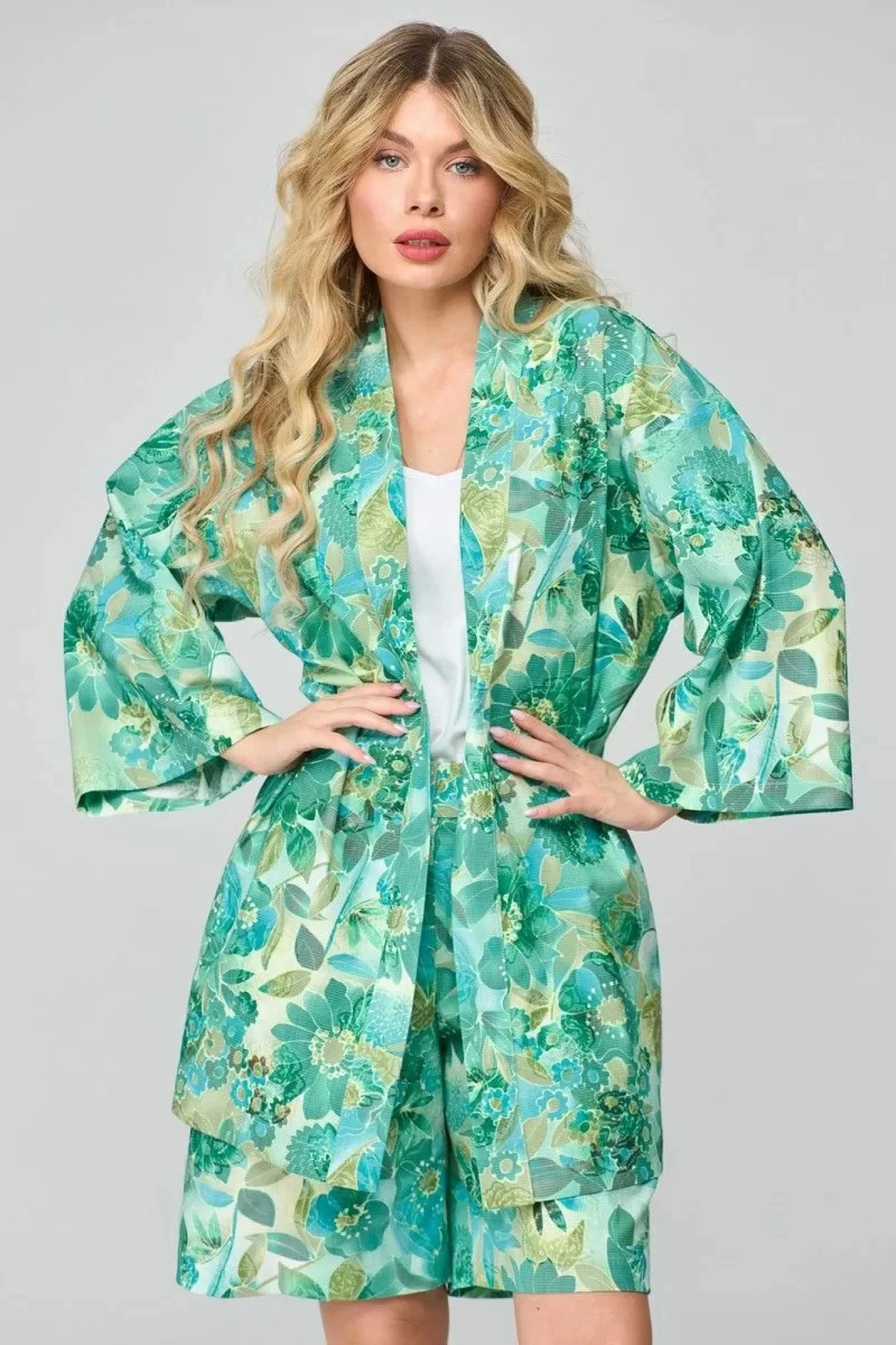 Свободный блузон-кимоно с ярким принтом не будет сковывать движения и придётся вам по вкусу. Блузон прямого силуэта, без застежки. Вырез горловины V-образной формы. Край борта полочки обработан притачной планкой. Рукав широкий, длиной ¾, со спущенным плечевым швом. В комплекте завязывающийся пояс из основной ткани.