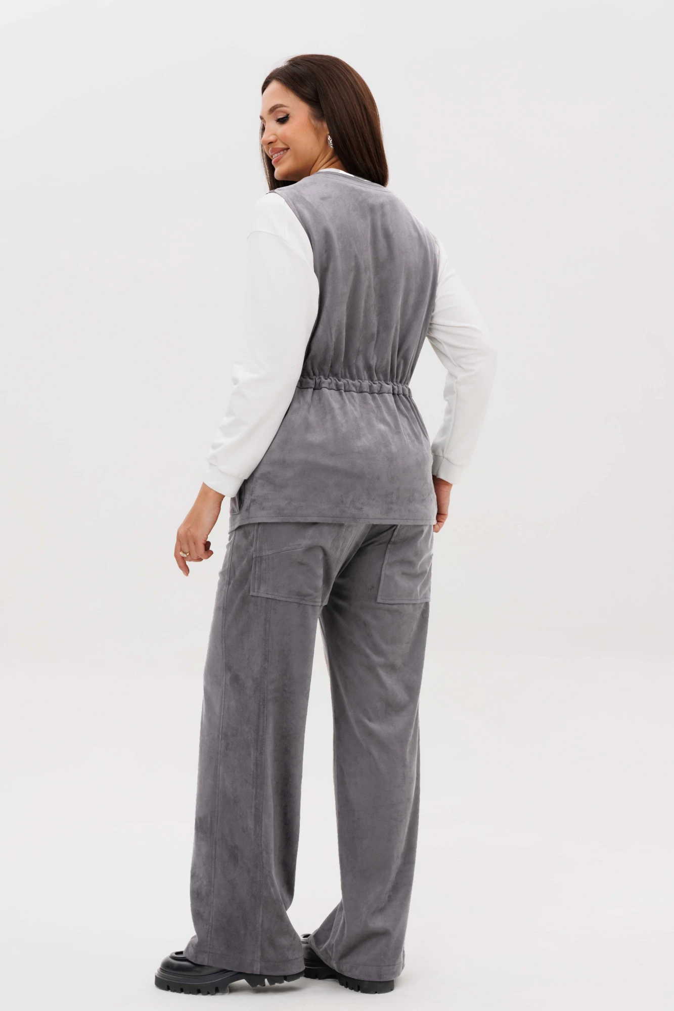 Образ, который говорит сам за себя, смелый и дерзкий, и в то же время очень комфортный. Нестандартный жилет с накладными карманами-пеналами с клапаном. Регулирующая кулиса, подчеркивающая талию. Свободный силуэт, центральная застежка на тесьму молнию, фигурная линия низа. Жилет на подкладке.