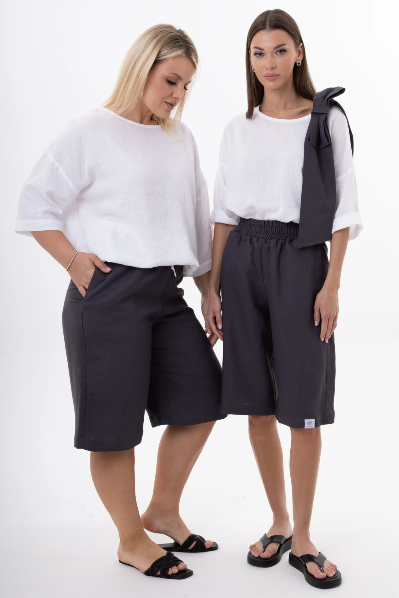Эксклюзивный летний костюм из белорусского льна с вискозой — идеальное сочетание элегантности, комфорта и функциональности. Набор включает джемпер свободного прямого силуэта со съемным декоративным бантом и шорты на эластичной резинке с боковыми карманами. Натуральные материалы обеспечивают дышащую легкость, гипоаллергенность и устойчивость к деформации, сохраняя безупречный вид даже в жаркие дни.