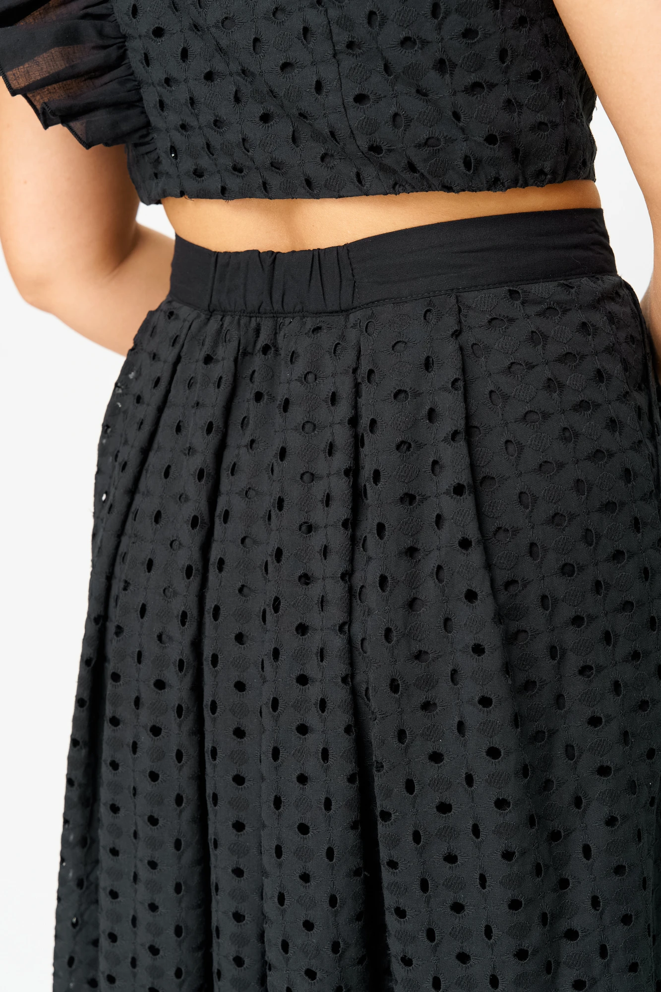 Юбка длиной макси на подкладке, с бантовыми складками по талии и наклонными карманами по передним половинкам. В левом боковом шве обработана потайная молния. По талии юбка на притачном поясе с эластичной тесьмой по задней части пояса и застежкой на петлю и пуговицу с левой стороны. Низ юбки обработан притачным воланом из однотонной гладкой ткани.