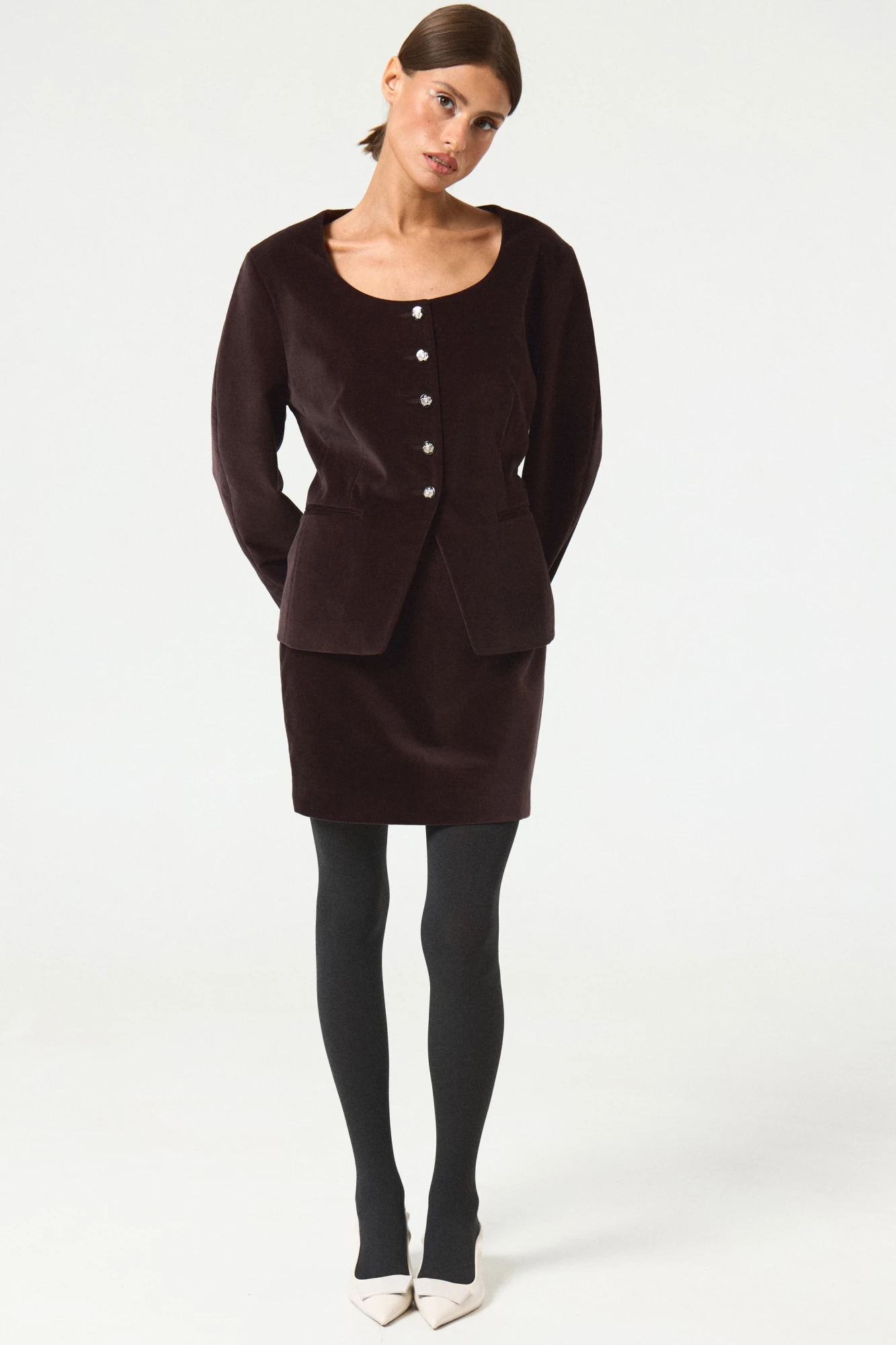 Комплект женский, жакет с юбкой, из костюмной ткани. Жакет без воротника, на притачной подкладке. Полочка с нагрудной вытачкой и рельефом. На полочках два прорезных кармана в рамку. Горловина обработана подбортом и подкладкой по спинке. Спинка со шлицей в среднем шве и рельефами. Рукав трехшовный, втачной в закрытую пройму. В локтевом шве рукава шлица на три петли с глазком и три пуговицы. На подкладке спинки заложена складка. Юбка в длине мини, прямого силуэта на поясе. Застежка-молния