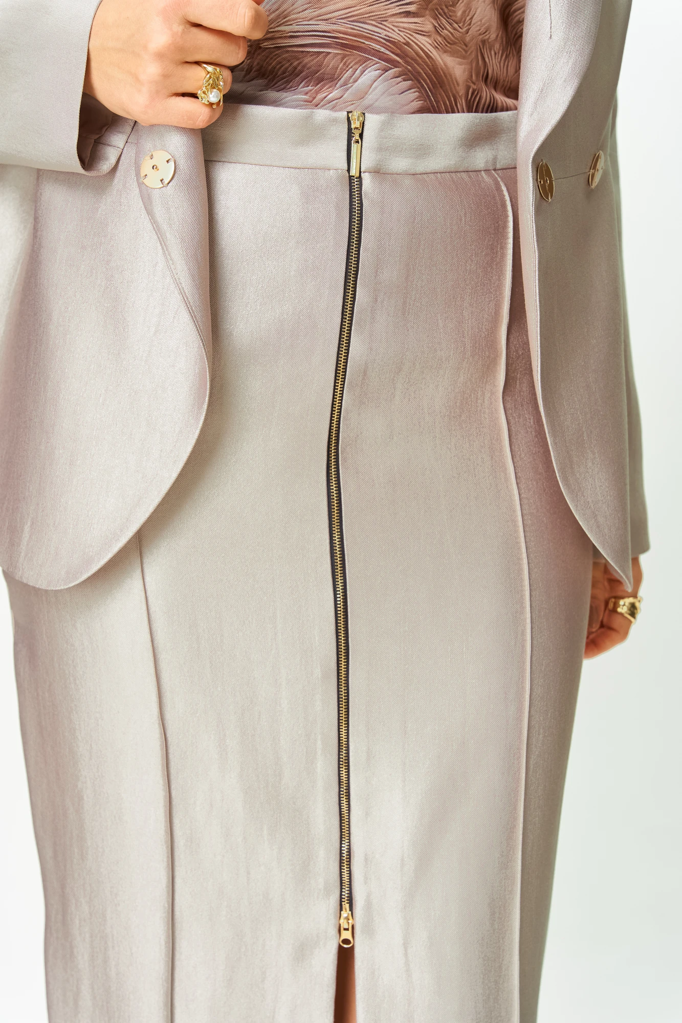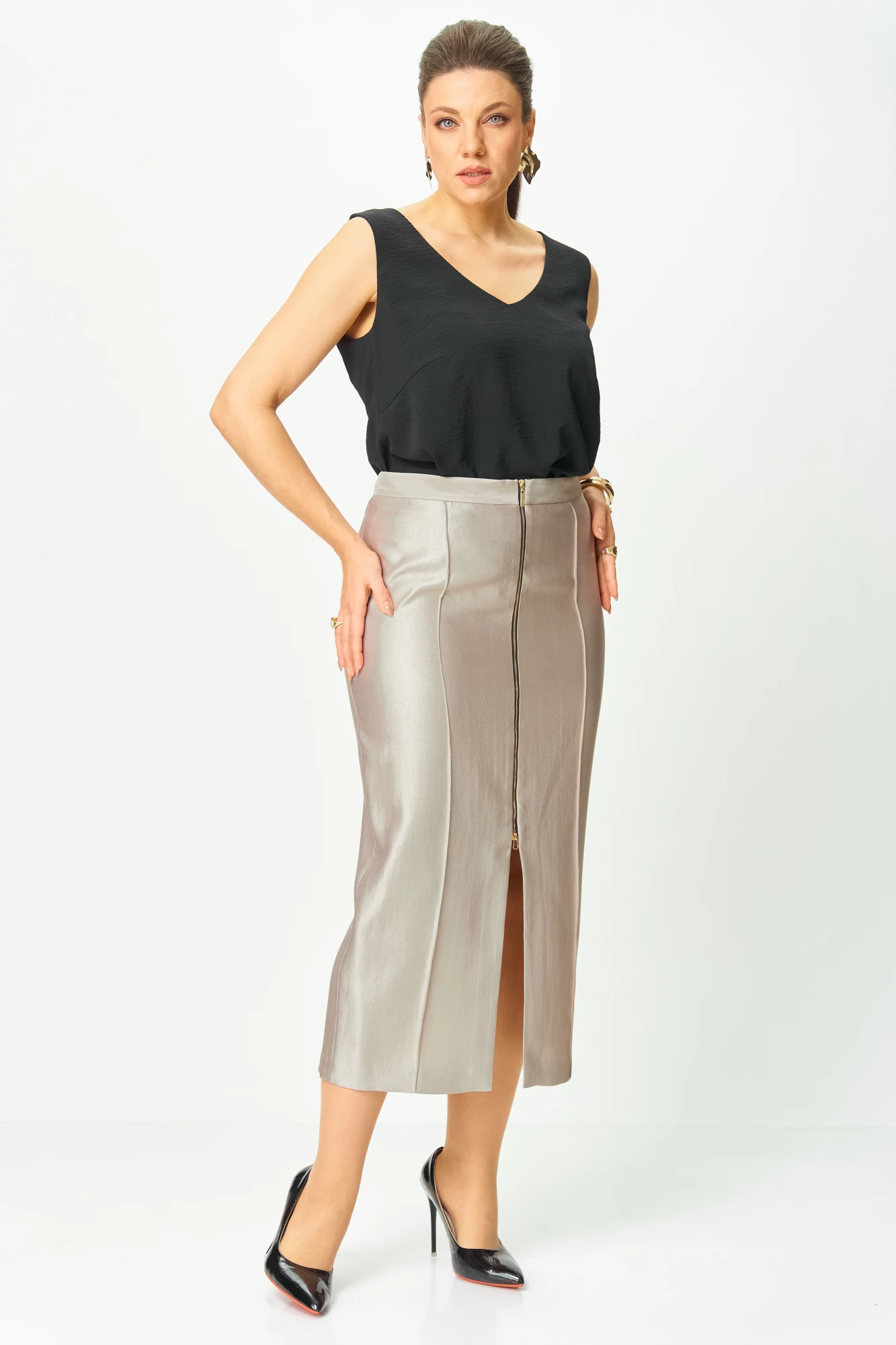 Юбка прилегающего силуэта, заужена к низу, по переде застрочены рельефные швы, застежка на декоративную молнию по центру переда. Верх юбки на притачной поясе.