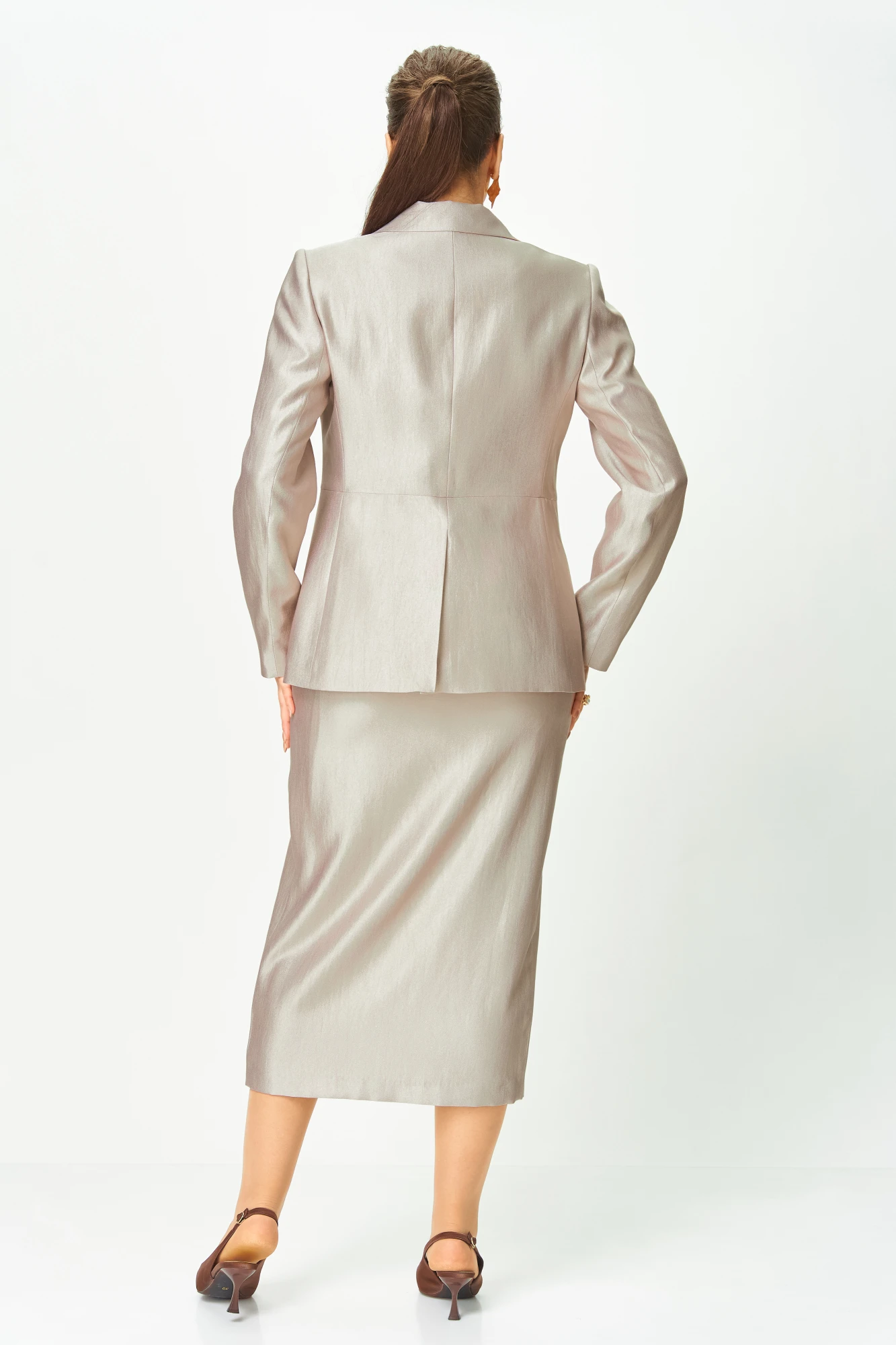 Жакет полуприлегающего силуэта, отрезной по линии талии, горловина оформлена воротником пиджачного типа с отложными лацканами, застежка по линии талии на кнопки, по краю борта пришита декоративная пуговица. В центральном шве спинки шлица. Рукава втачные.