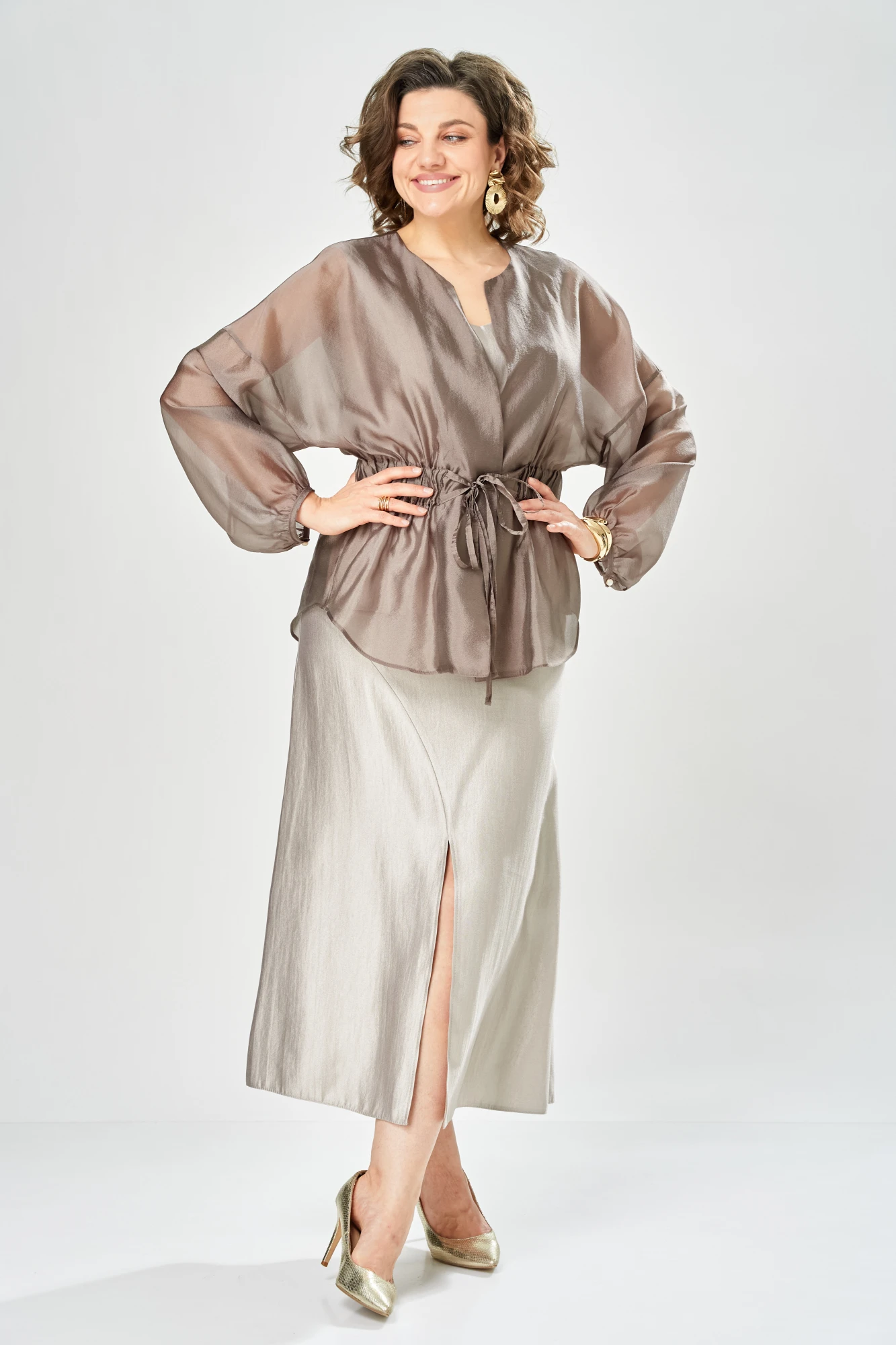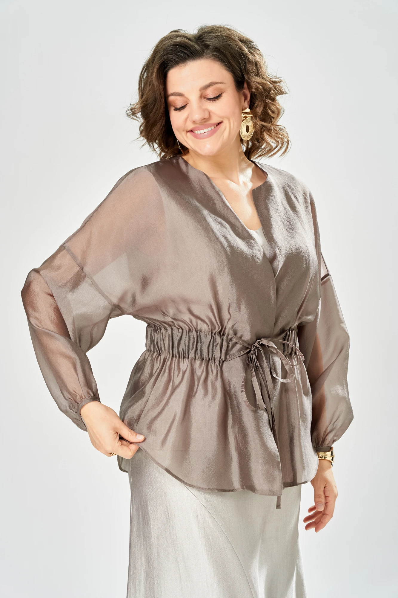 Блузон выполнен из полупрозрачной легкой ткани, свободного силуэта, без застежки, горловина круглая, линия плеча спущенная, рукава широкие со сборкой по низу. Блуза по линии талии собрана на резинку по центру переда фиксируется на завязки.