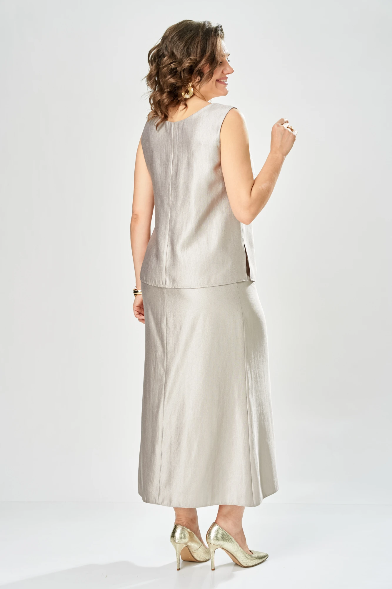 Юбка расширенная к низу, по переду фигурный рельеф с разрезом по низу, застежка в среднем шве спинки на тесьму молния. Юбка на подкладке.