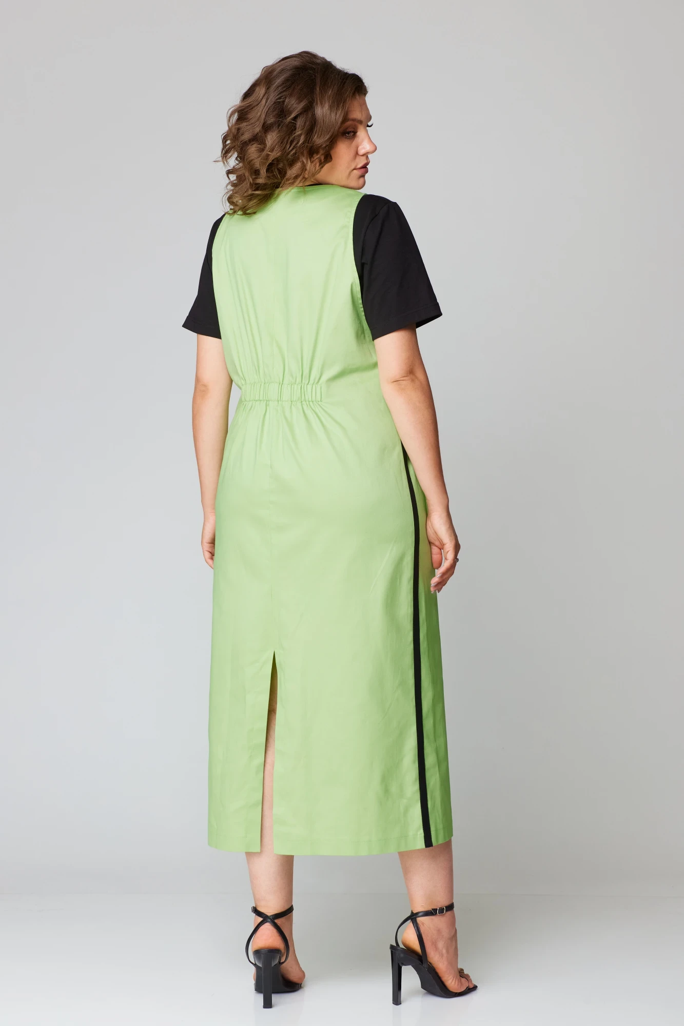 Сочетание прямого кроя и однотонного дизайна делает его универсальным элементом гардероба. Сарафан с V- образной горловиной с углубленной проймой. Стилизованное расположение накладных карманов, рельефных линий и настрочной тесьмы придают индивидуальность и современный стиль образу. Легкое прилегание силуэта достигается эластичной тесьмой со стороны спинки. Свободу шага обеспечивает разрез по центру спинки.