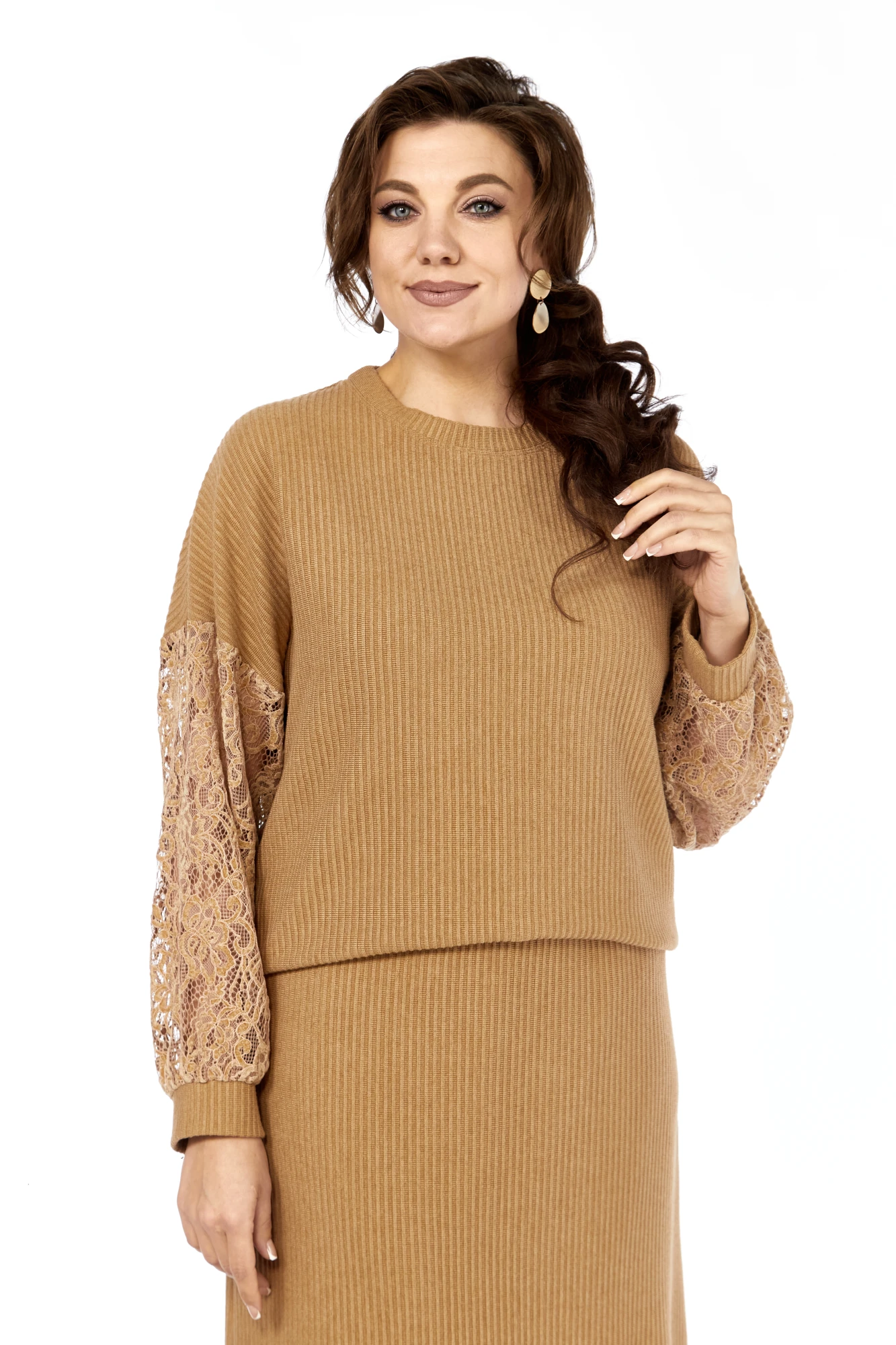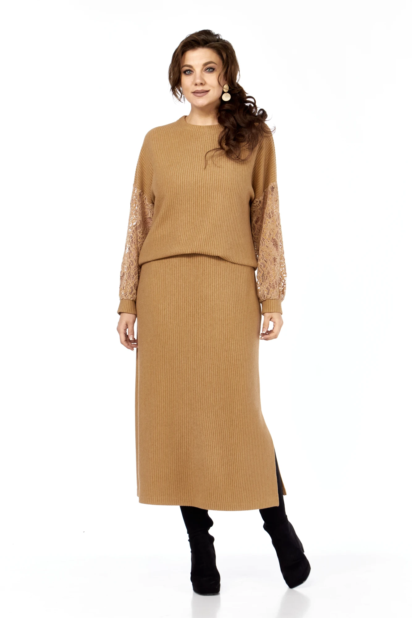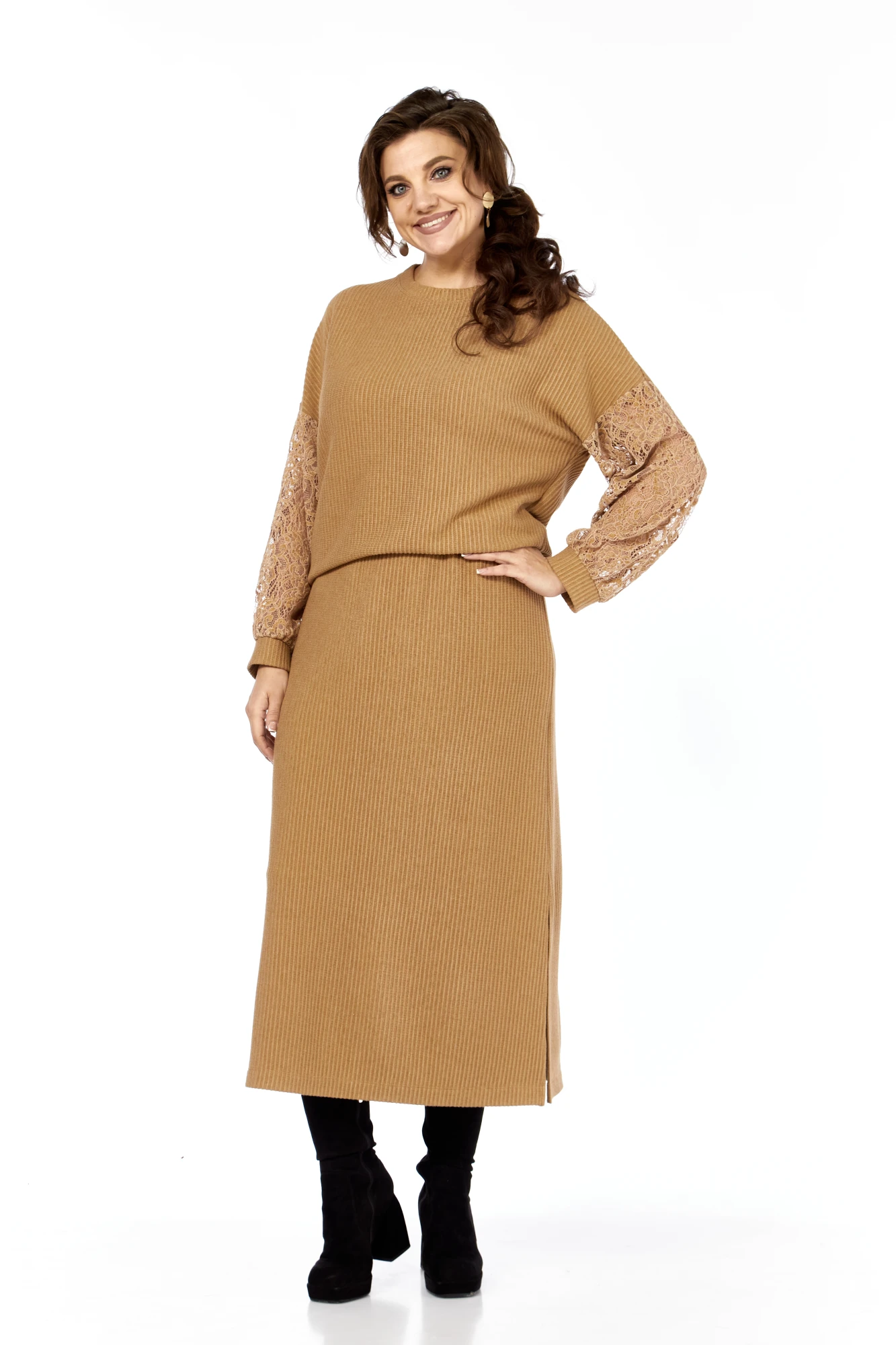 Осенний комплект джемпер и юбка, выполнен из мягкой и приятной к телу трикотажной ткани с добавлением натуральных нитей, рукава комбинированы кружевом - это идеальный выбор для стильных и изысканных дам. Данный юбочный костюм идеально подходит как для офиса, так и для неформального повседневного использования.