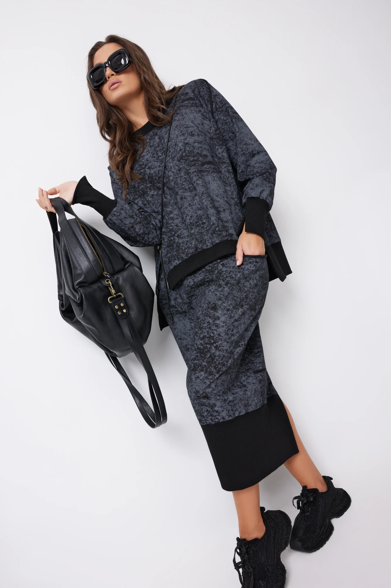 Размер 50: Джемпер: ОГ- 132, ОТ-132, ОБ-108,ширина рукава на уровне ОП-23, ширина рукава на уровне низа-9,5, длина рукава реглан-72, длина изделия спинки по центру-69. Юбка: ОТ в собр.-72, ОТ в раст.-86, ОБ-112, длина изделия по боковому шву с поясом-80.