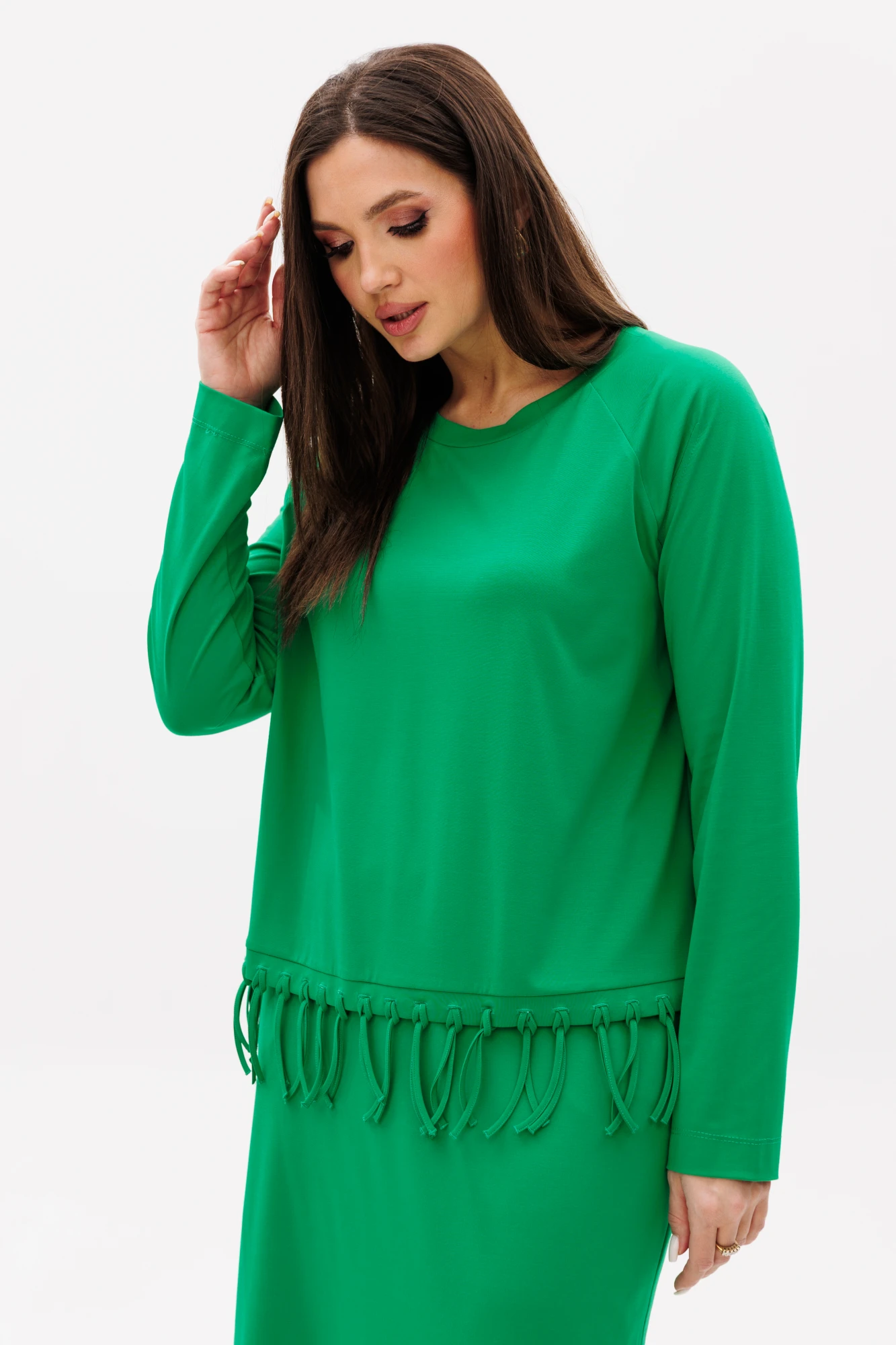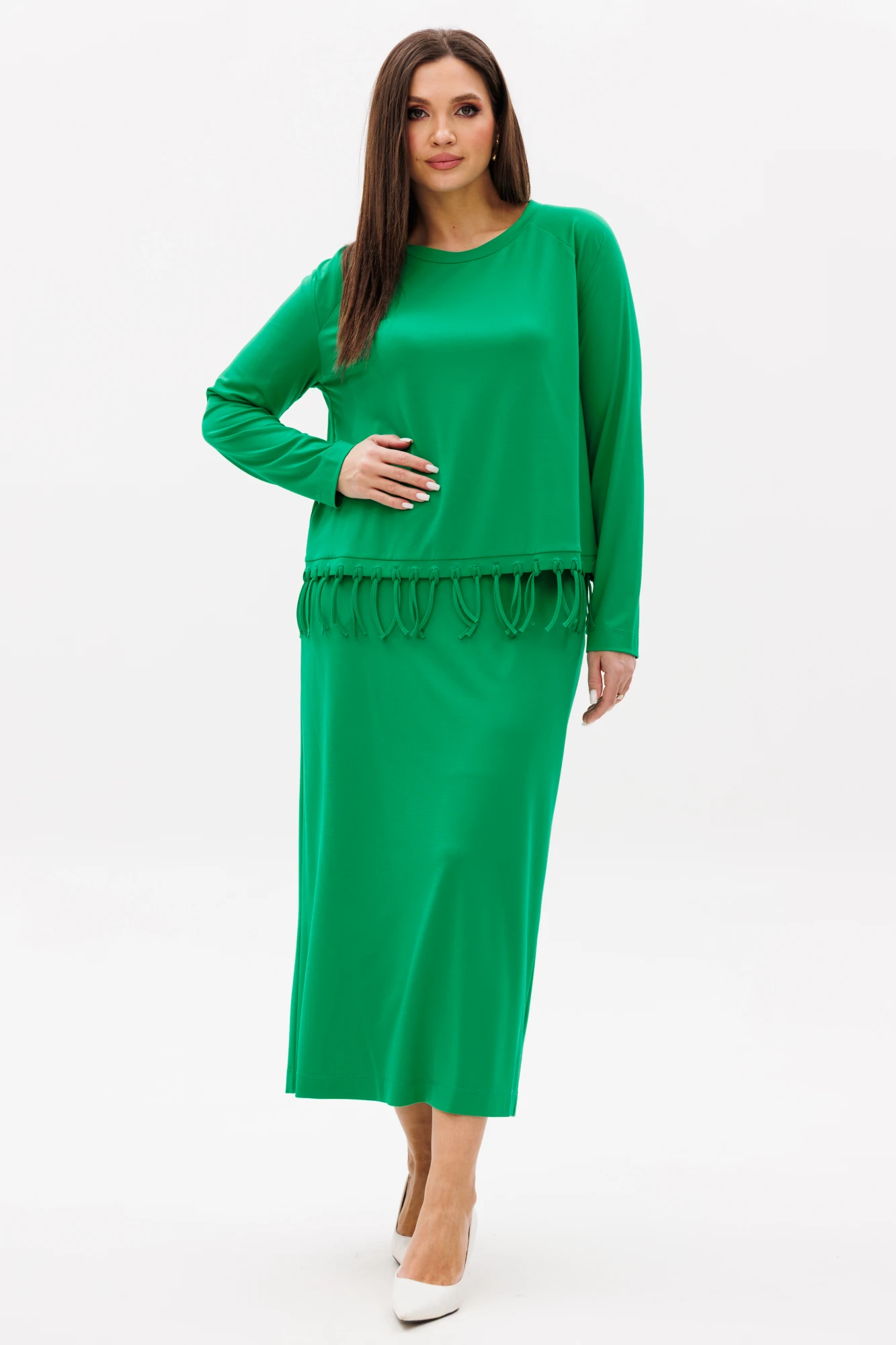 52Свободная блуза А-силуэта, покроя реглан с круглым вырезом горловины. Низ изделия с отделочной полоской и бахромой. Юбка макси, на эластичном поясе, с наклонными боковыми карманами и шлицей по заднему полотнищу.